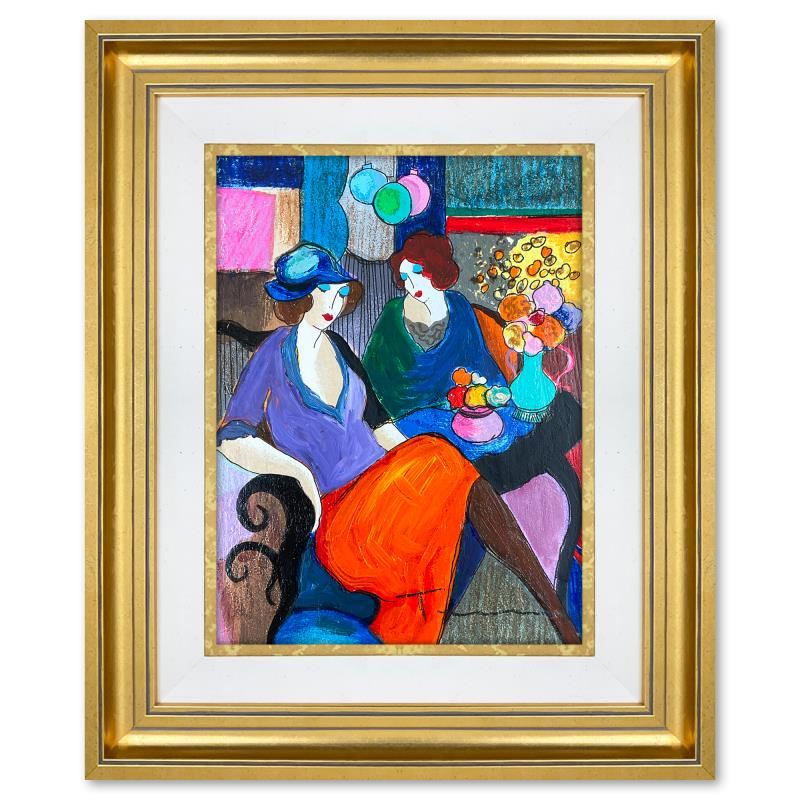 "Chit Chat" is a one-of-a-kind mixed media over paint on wood by Itzchak Tarkay (1935-2012), hand signed by the artist. This piece comes custom framed. Includes Letter of Authenticity. Measures approx. 17" x 15" (frame), 9" x 7" (image). This item requires special handling and may have a longer than usual turnaround.