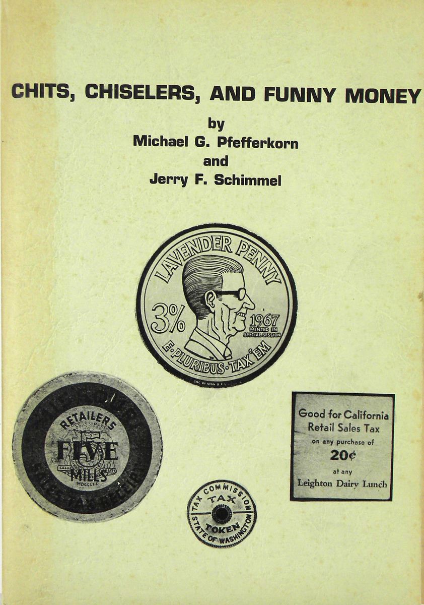 Pfefferkorn, Michael G., and Jerry F. Schimmel. CHITS, CHISELERS AND FUNNY MONEY. A HISTORY AND CATALOGUE OF UNITED STATES SALES TAX TOKENS, RECEIPTS AND PUNCHCARDS. Buffalo, 1977. 8vo, original printed card covers. (3), xi, (1), 147, (1), 148-242, (1) pages; text illustrations; 24 plates. Pricelist laid in. Near fine. Infrequently offered.