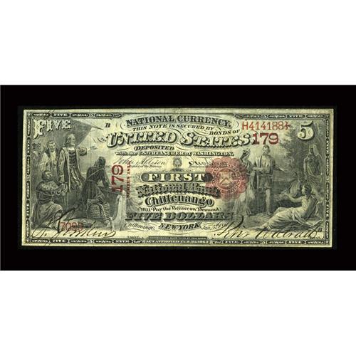 <B>Chittenango, NY</B></I> - $5 1875 Fr. 401 <B>The First NB</B></I> Ch. # 179<BR>An extremely rare note from the only bank to issue in this Madison County hamlet. This short lived institution issued First Charter examples only before liquidating in 1883, with a mere three pieces comprising the entire census. Our consignor has owned this note for nearly three decades, and its appearance here after all those years affords the opportunity for one other fortunate collector to add a note from this most elusive location to his holdings. Nice <B>Fine-Very Fine.</B></I><BR><BR><b>Shipping:</b> Coin/Currency (<a target="_blank" href="http://www.heritageauctions.com/common/shipping.php">view shipping information</a>)
