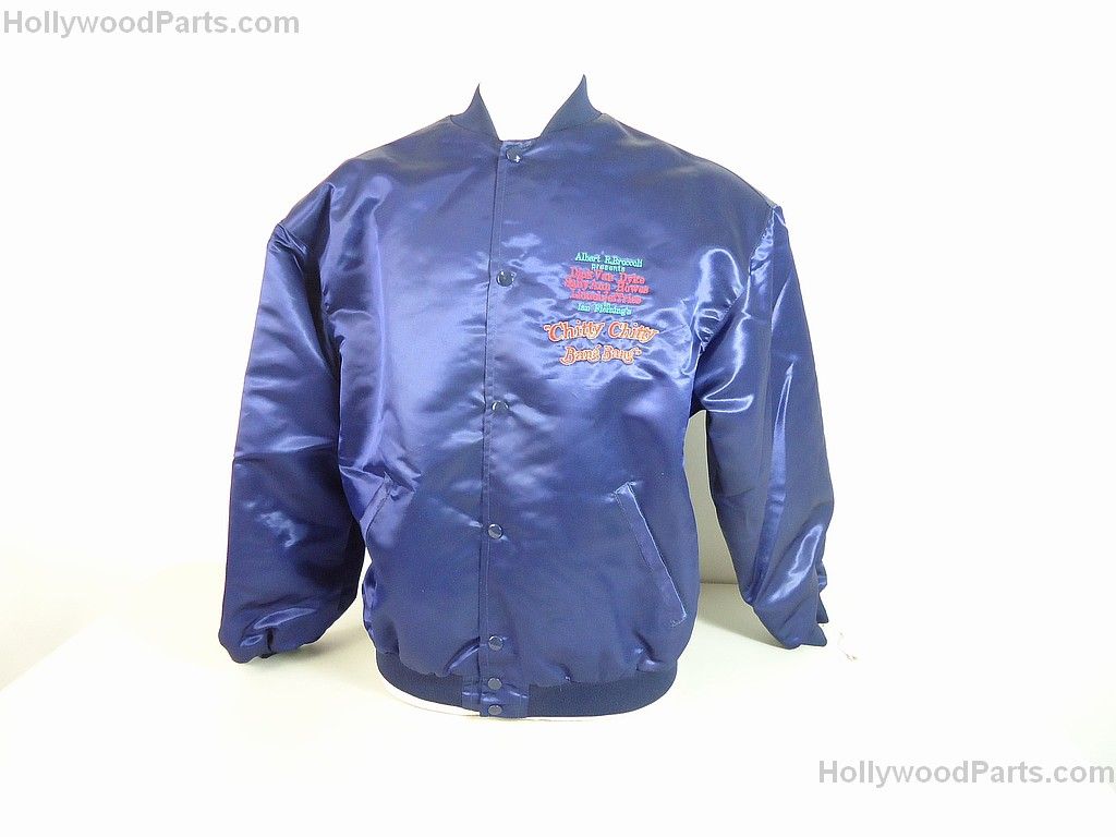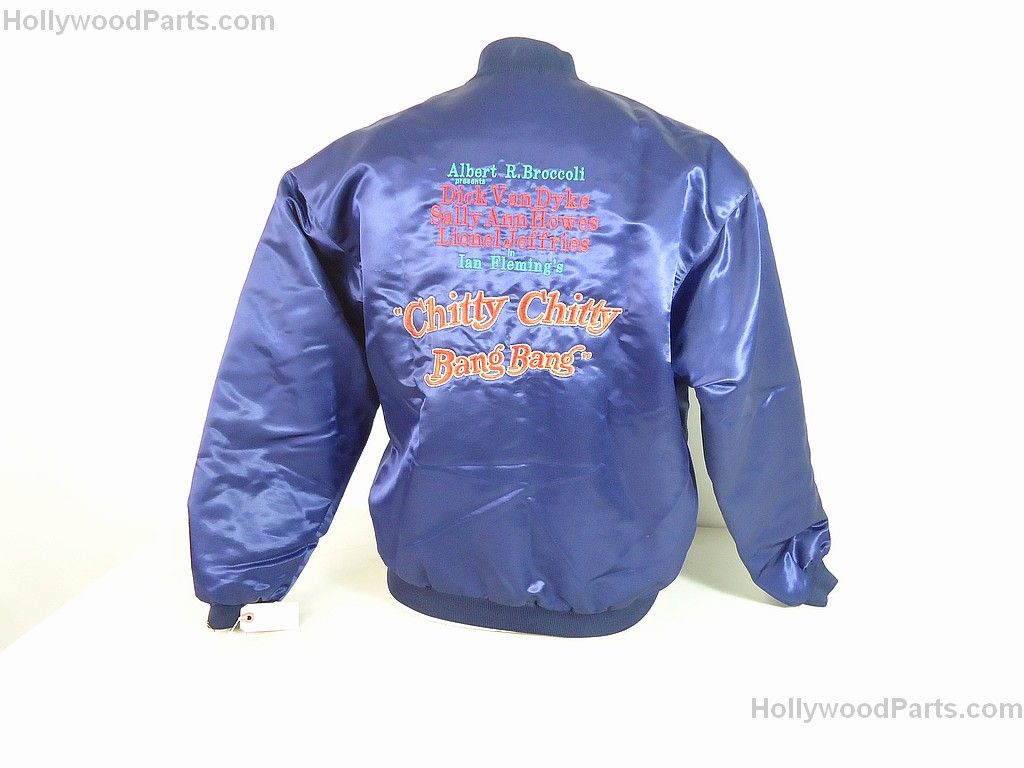 Blue satin promotional Chitty Chitty Bang Bang Jacket. Features embroidered names of movie title, main characters, producer and writer. Jacket is made of soft satin and fits an large to extra large. Great condition. Used for promotional events and marketing. Made by original production crew.
