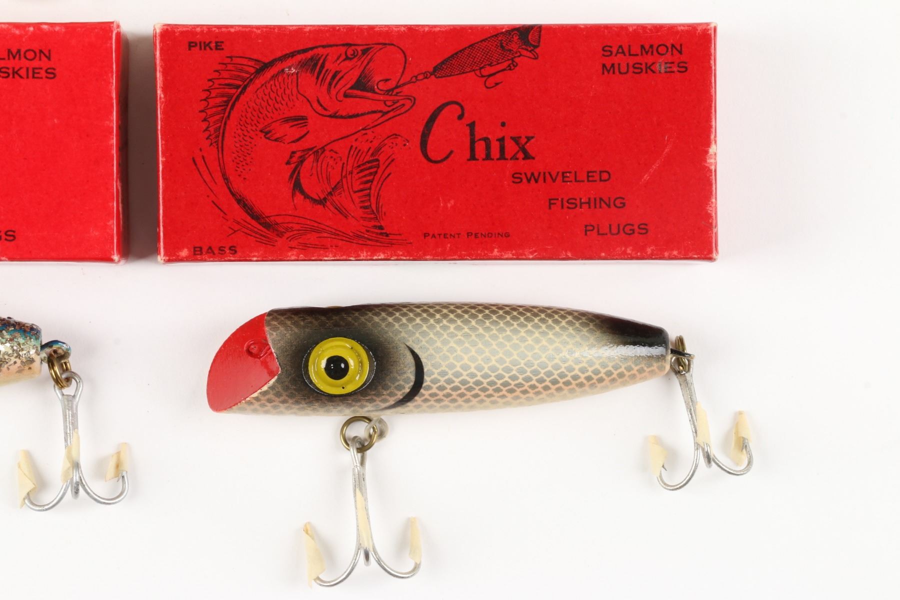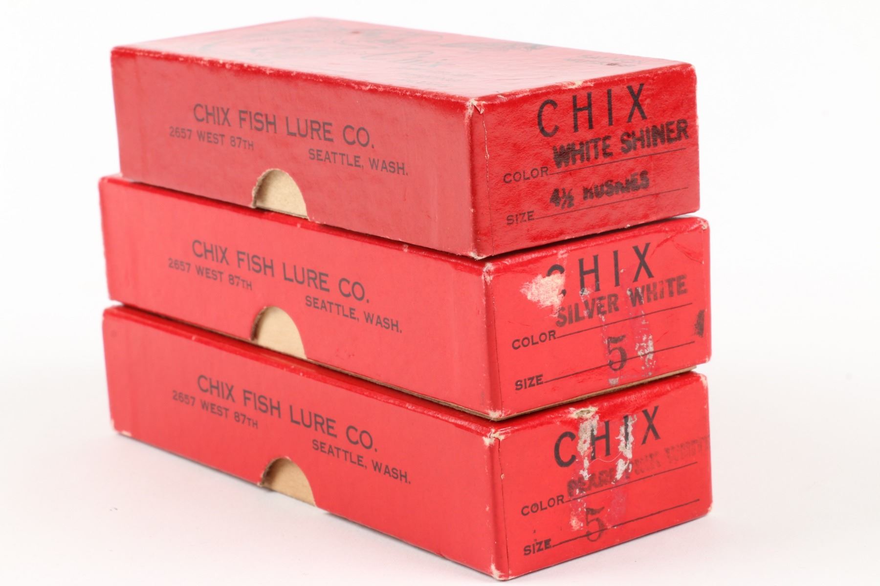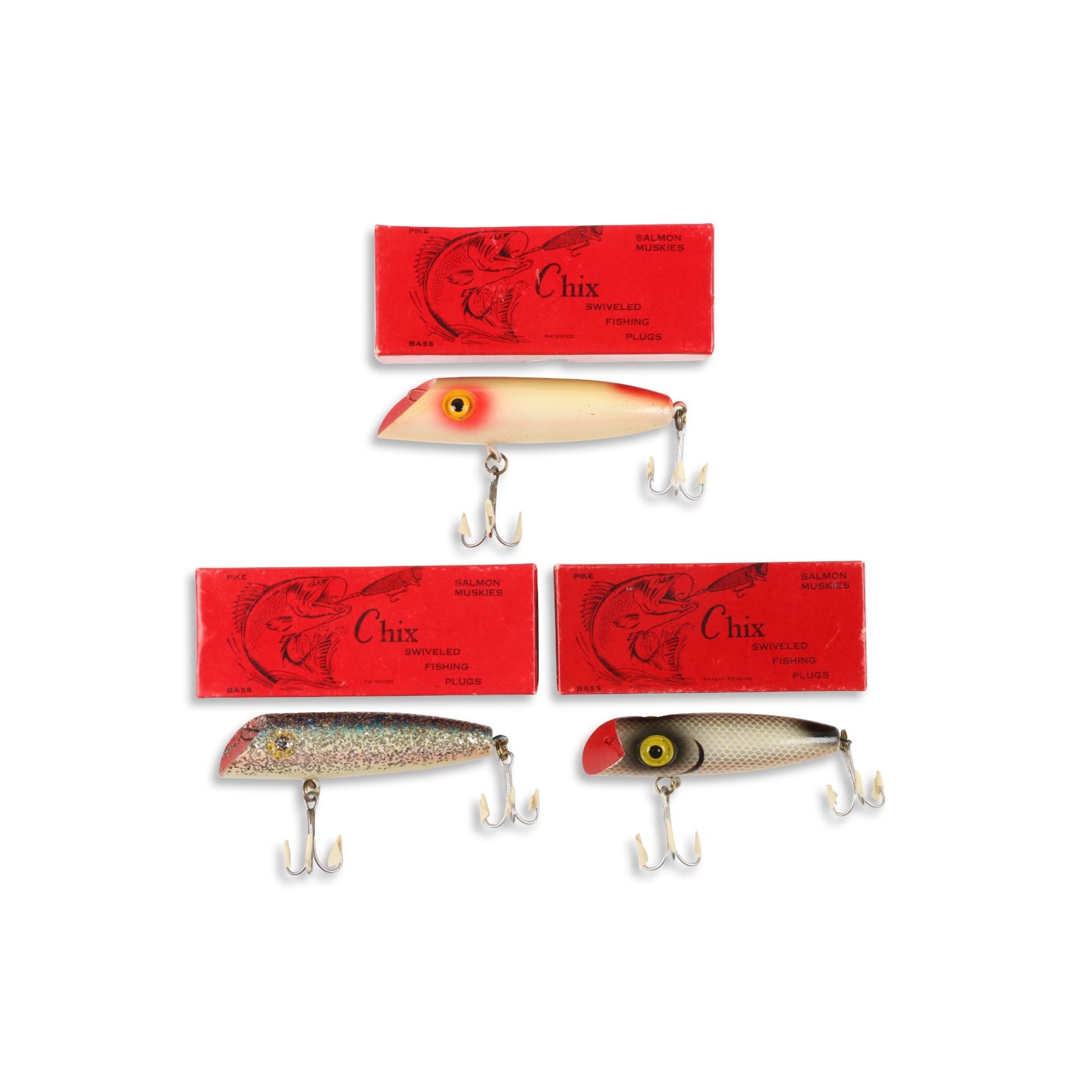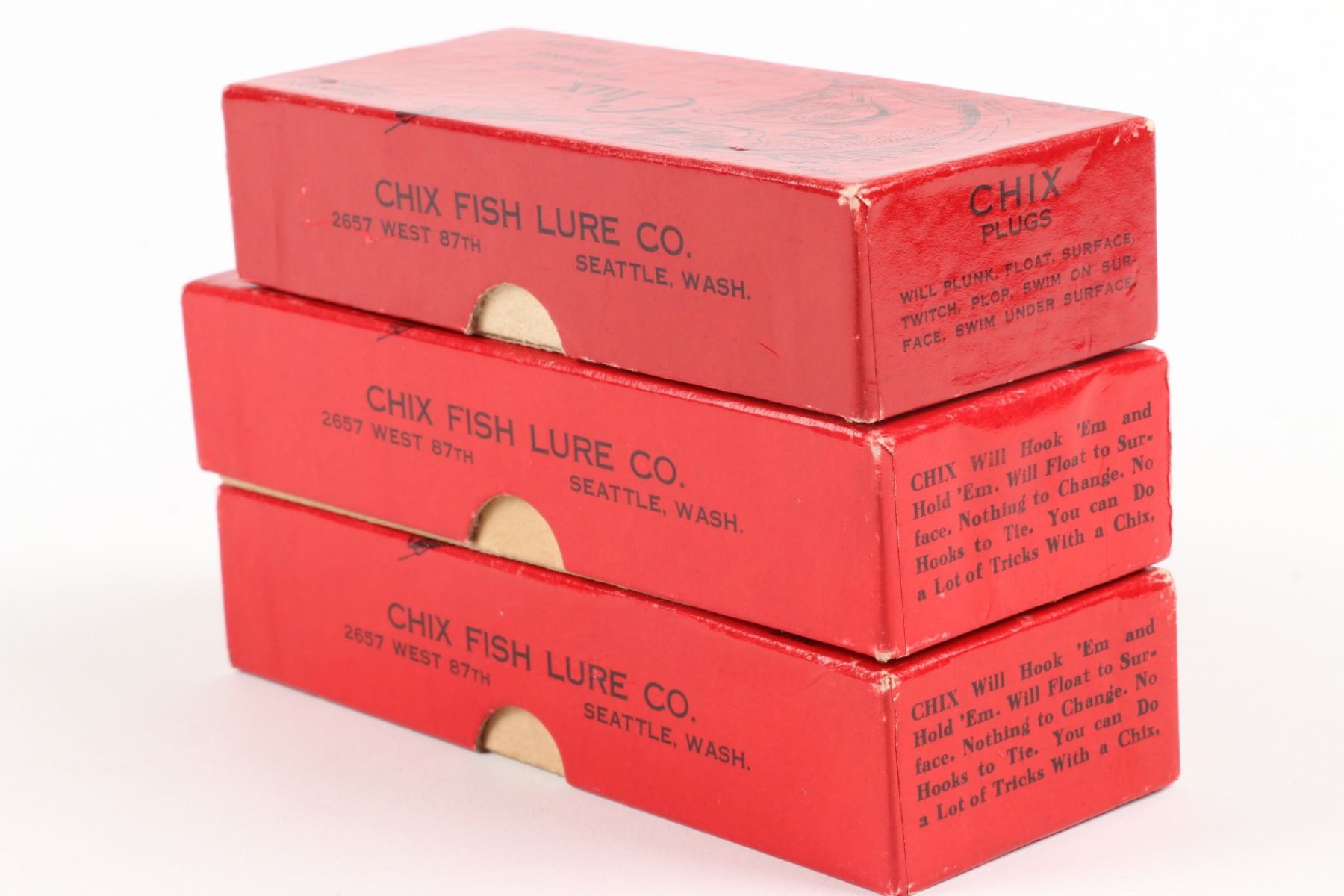 Chix Fishing Lure Co., United States. Boxed. Material: Wood. Quantity: 3. Grade: VG+. 5.25" - 5.75" boxes. Est. $100-125.