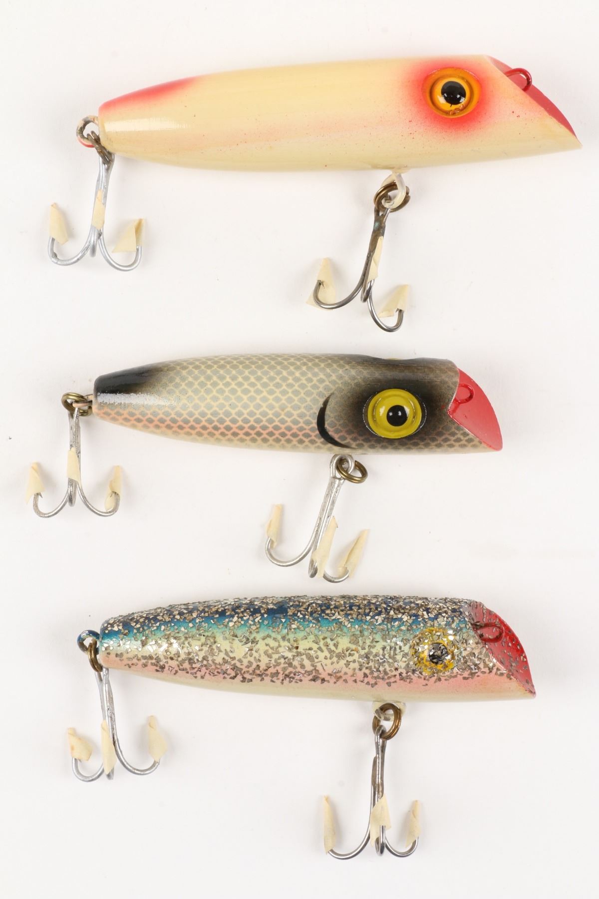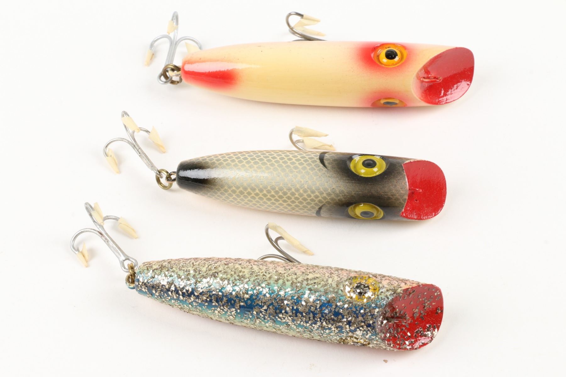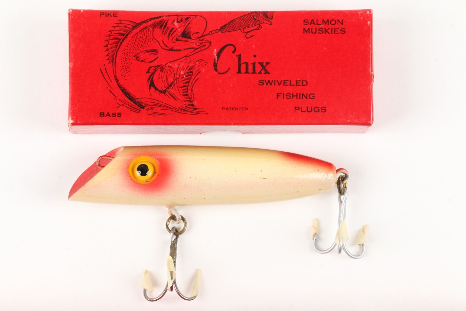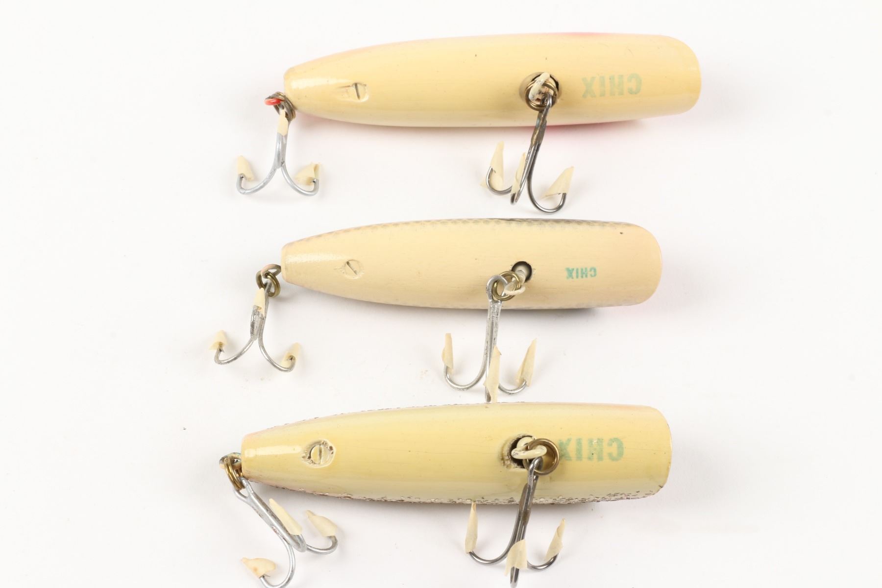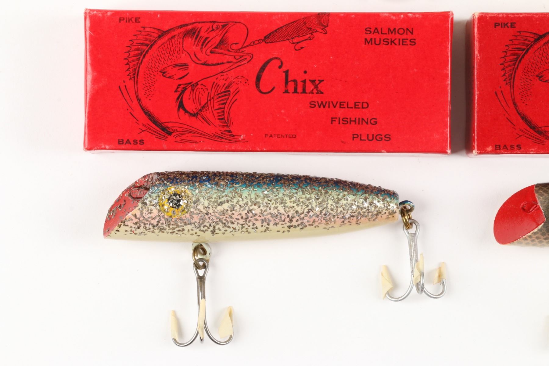Chix Fishing Lure Co., United States. Boxed. Material: Wood. Quantity: 3. Grade: VG+. 5.25" - 5.75" boxes. Est. $100-125.