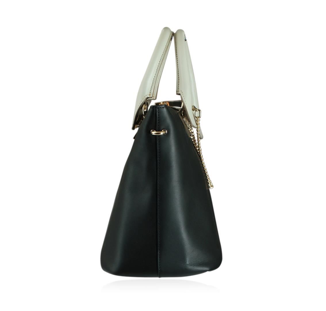 New with tags, Chloe "Baylee" black and gray calfskin shoulder/tote bag featuring: polished pale-gold tone hardware. Lined with fabric; one zip pocket, one card slot and two slip pockets at interior. Rolled top handles; detachable, adjustable shoulder strap. Top two-way-zip closure styled with chain detail. 10" height x 17.0" width x 6.0" depth (approximately). 4" handle drop, 18" maximum strap drop (approximately). Made in Italy. Comes with original Chloe dust bag.