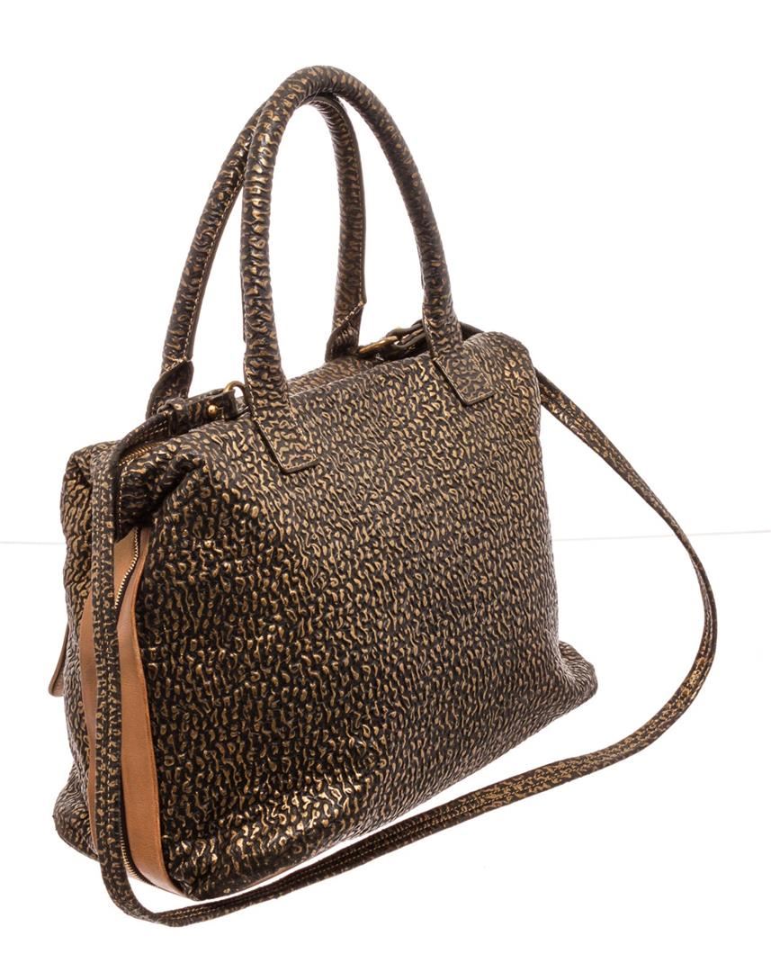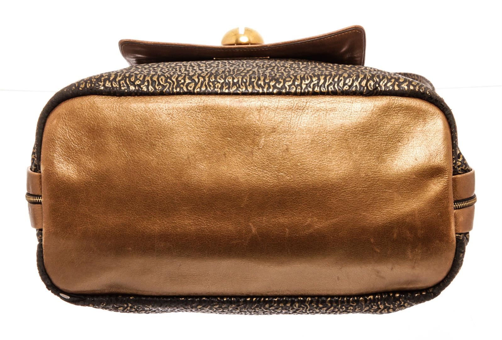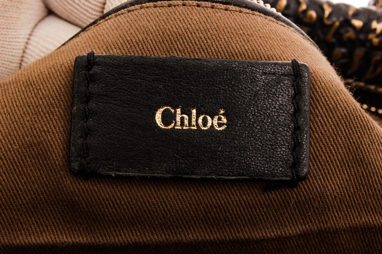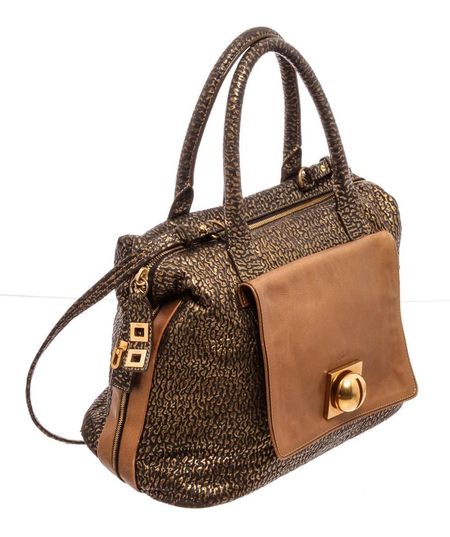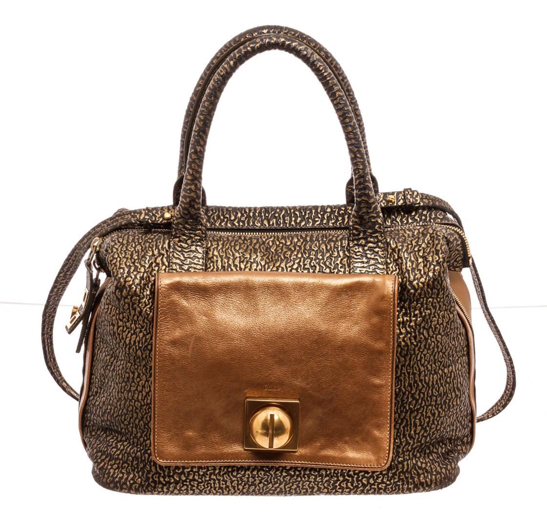 Chloe Brown Leather Two Way Shoulder Bag with gold-tone hardware, trim leather, dual top handle, shoulder strap and zipper closure.