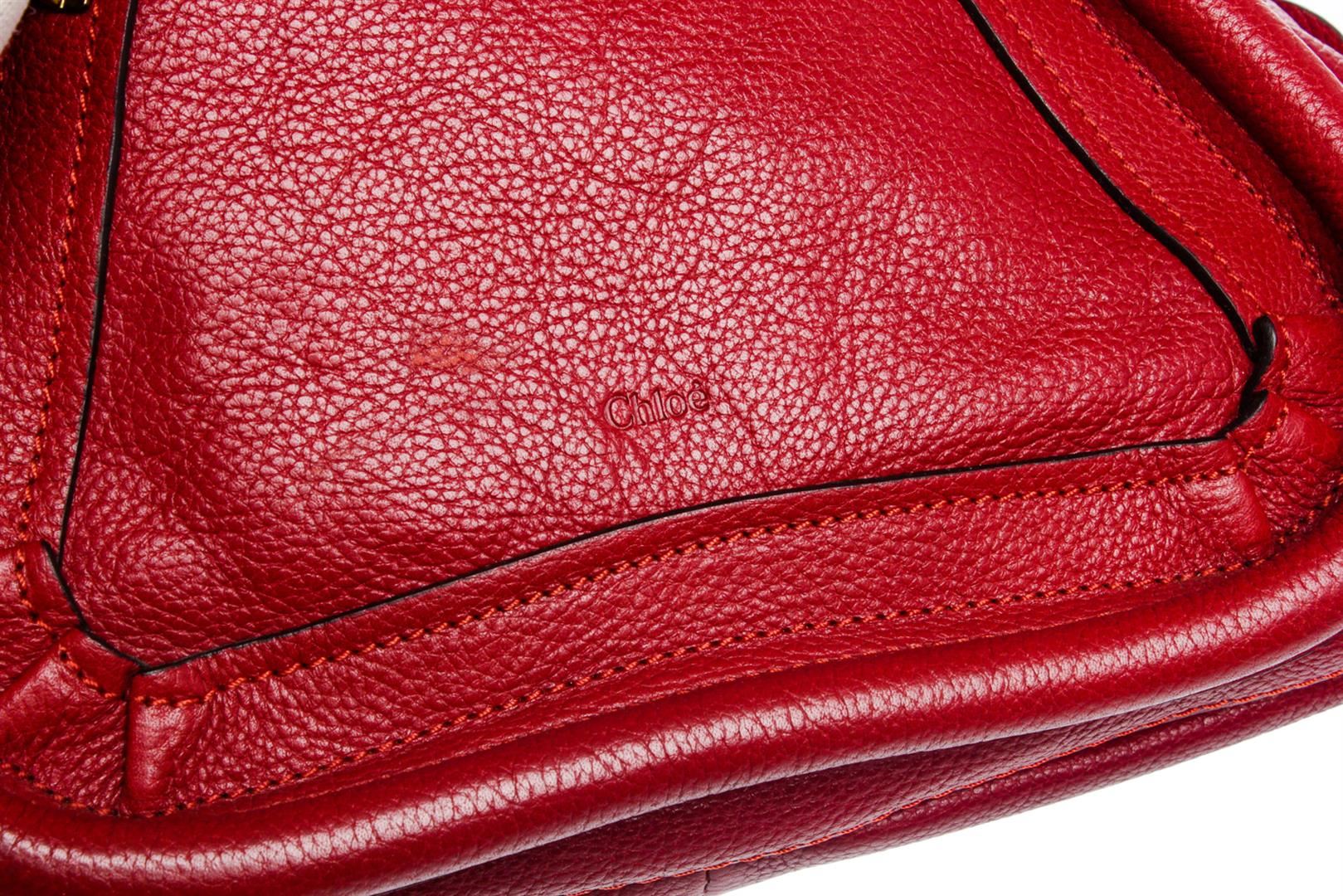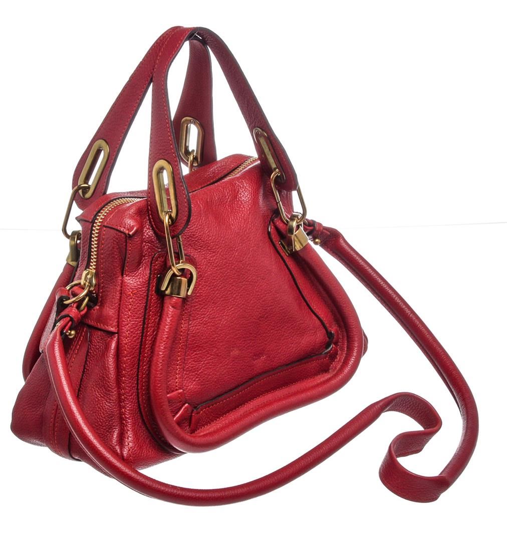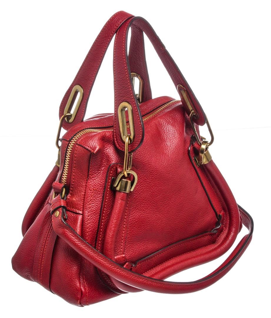 Crafted out of red leather, dual flat handles, gold tone hardware, and zip top closure. Inner is black fabric lined with one side zip pocket.