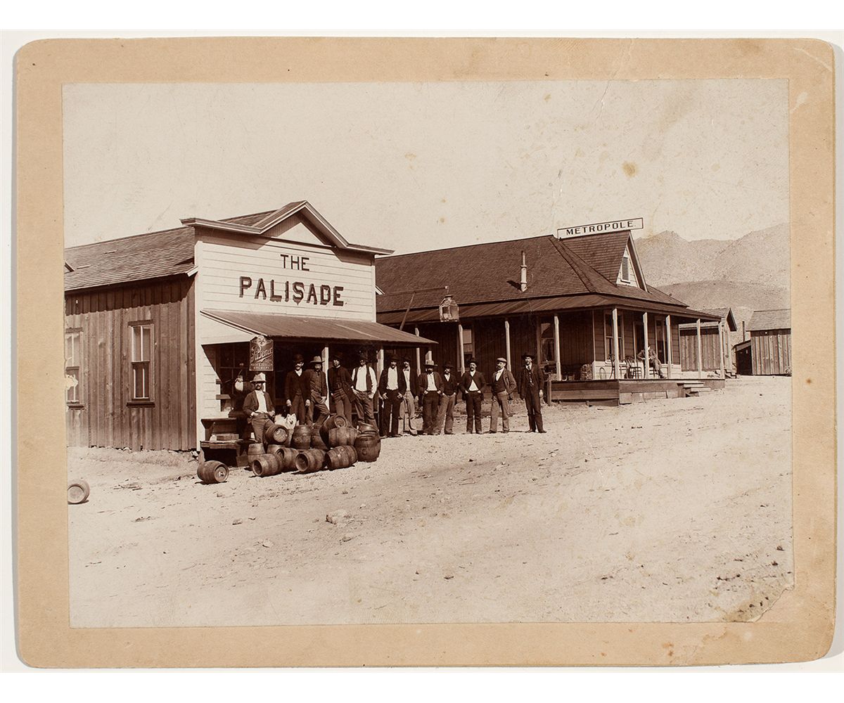 c1905 This photograph features 12 men and a dog stand posed for a photo in front of the Palisade. A sign for Pilsener Lager can be seen hanging in front. The focus is sharp and the contrast is strong. The photograph measures 8” x 5.95” and the matte measures 9” x7.” There is no photographer identified. Bud Bassett Collection - HKA#65430