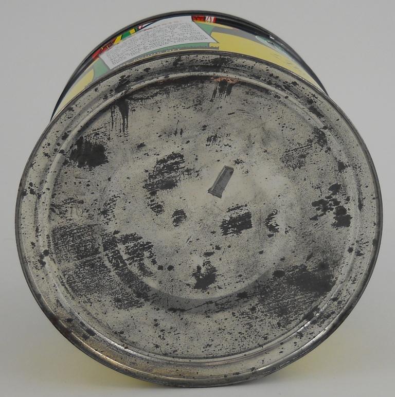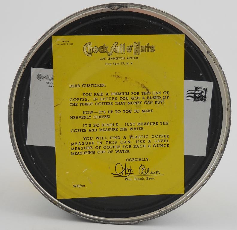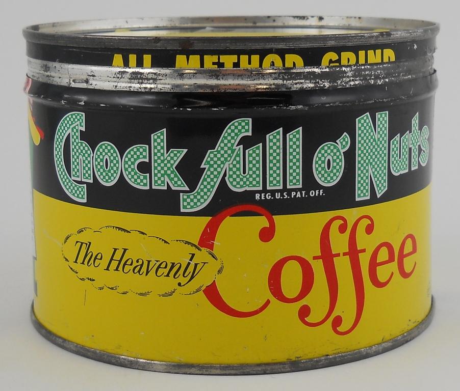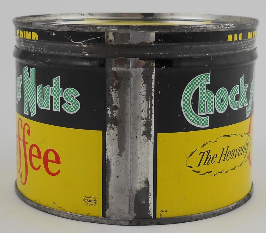 This is a one-pound key-wind can from Chock Full O' Nuts Corp. of New York, for Chock Full O' Nuts Coffee. It is about 3-1/2 inches tall x 5 inches in diameter. It shows a zone (rather than zip code) in the address on the top, which would date it between 1945 and 1963. It is a nice clean can!