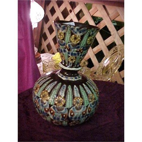 Very Unique Vase! This one is truly different! This vase stands over 8" tall and it is a Rich Beautiful Chocolate Color with Turquoise colored Feathers all over its surface. Priced to sell at $90