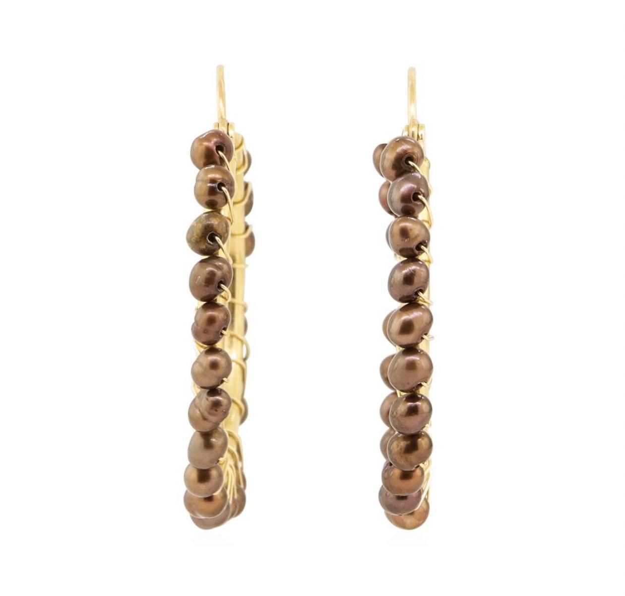 One pair of hoop shaped earrings with a diameter of 34 millimeters featuring: 14KT yellow gold weighing 4.0 grams containing chocolate freshwater pearls.