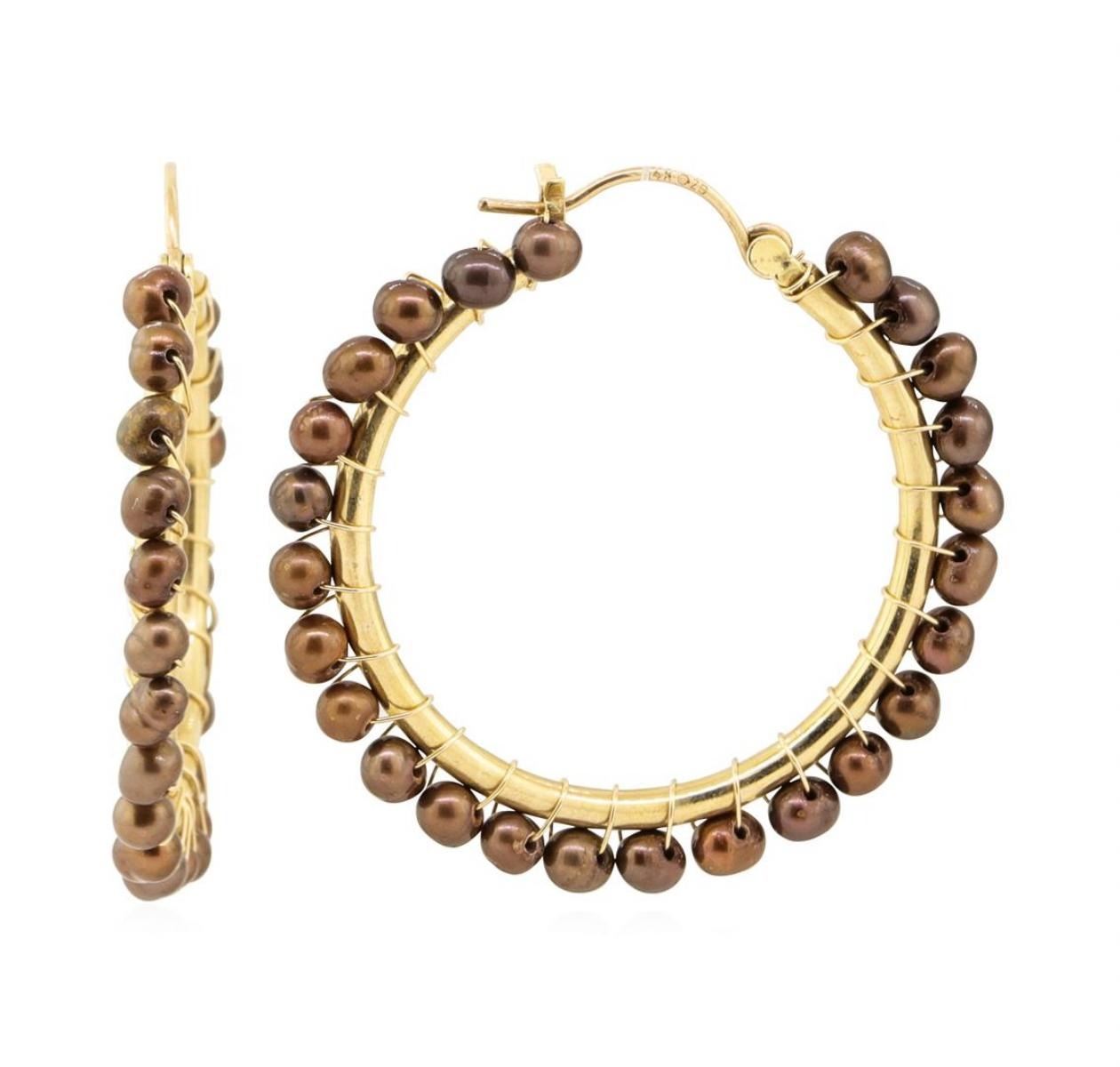 One pair of hoop shaped earrings with a diameter of 34 millimeters featuring: 14KT yellow gold weighing 4.0 grams containing chocolate freshwater pearls.