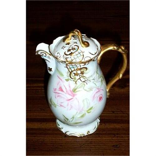 A nice hand painted white china Victorian chocolate pot with pink flowers, gold decoration and lid. There are two minor chips on the bottom of the base but it is otherwise in fine condition.