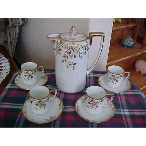 Chcolate ot Set 9 Pcs., signed Nippon; 4 cups, 4 saucers and 1 Chocolate ot , white sith gold overlay, good condition, no chips, no dings etc., a Beautiful set