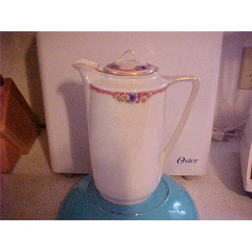 Chocolate Pot, signed Germany; white with band of roses on top side of pot and on cover , gold edge trim