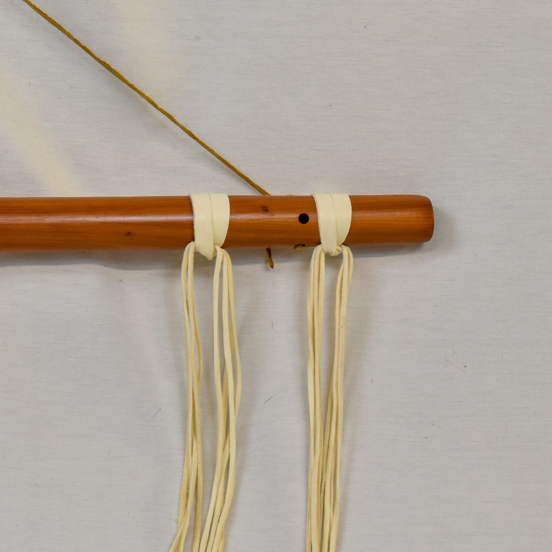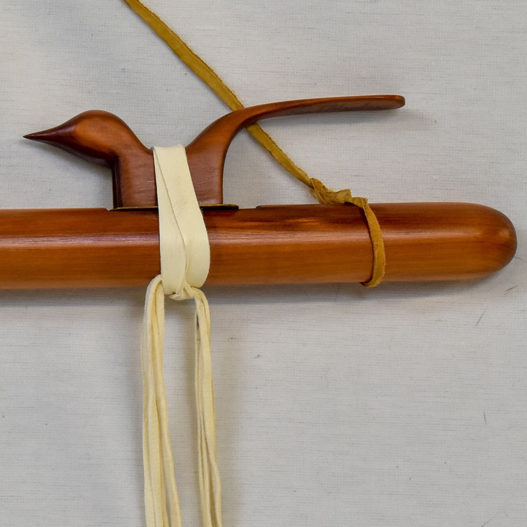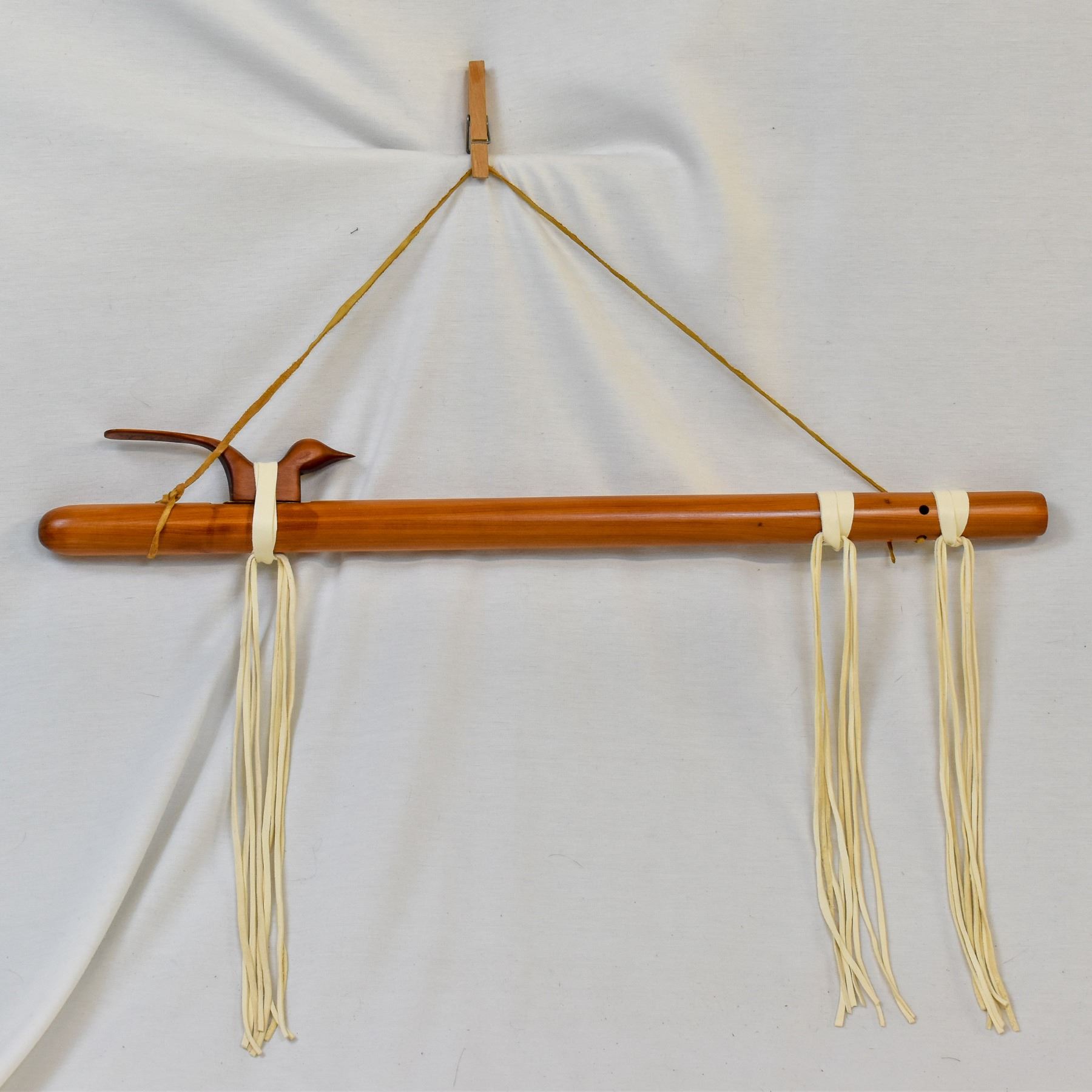 Native American Choctaw Red Cedar Flute by Paul Hacker, measures 24''L, embellished with fringed leather, bird block, signed under the bird's tail