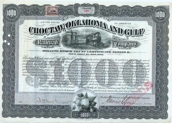 1901, Oklahoma. $1000 5% Rolling Stock Trust Certificate. Gray/Black. Engraved vignette of steam locomotive at top center, another of cotton at bottom center. Punch and stamp cancelled. Very fine.