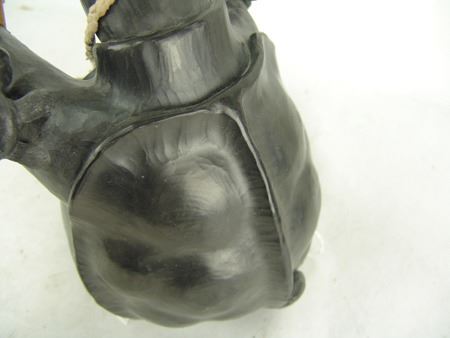Late 1900s, A wonderful original design black pottery turtle, seated and holding four babies and with a drum hanging from its neck. Very good condition, one head has been repaired. A rare find. 10"