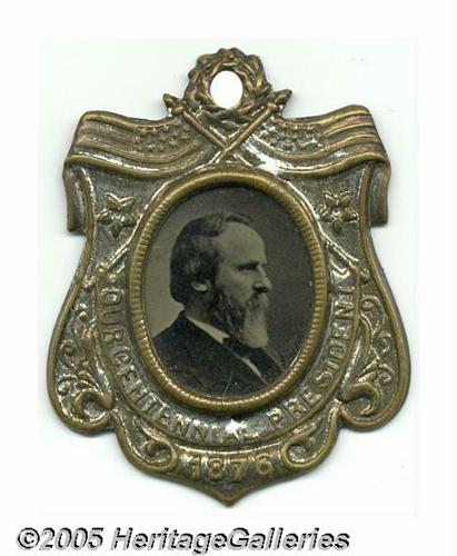 <B>Choice 1876-dated Rutherford B. Hayes Ferrotype</B></I> Set into fancy silvered brass-shell frame, reading, "Centennial President 1876" (a bit of a misnomer since Grant remained in office until Hayes' 1877 inauguration). Holed at top for suspension as made. This variety is very prone to flaking and bubbling of the ferro surface. While this example exhibits some very minor shallow bubbling, which does not break the surface of the emulsion, it is a distinctive superior example of this type. Lot:259