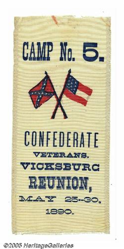 <B>Choice 1890 Vicksburg Confederate Veterans Reunion Ribbon</B></I> Desirable subject, beautiful condition. 2.5" x 5.75". Lot:251