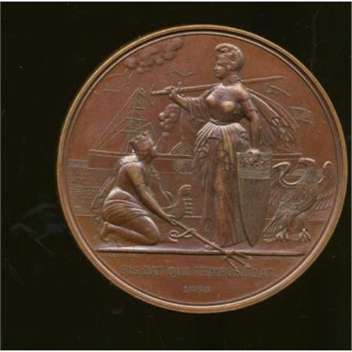 <B>Choice AU Cornelius Vanderbilt Mint Medal, Julian PE-36.</B></I> Bronzed copper, 76 mm, 261.2 gm. Obverse: Bust right, A GRATEFUL COUNTRY TO HER GENEROUS SON CORNELIUS VANDERBILT, six peripheral stars. Reverse: Allegorical scene with standing America facing a kneeling Neptune in the guise of a woman, steamship in the background. BIS DAT QUI TEMPORI DAT in exergue ("He gives twice who gives his time"). Date 1865, ELLIS SC. and LEUTZE DEL. also in exergue. <BR> A nice, lightly circulated walnut-brown piece with good eye appeal and no spots, this issue is unplated in Julian and is one of only 85 pieces struck of this scarce medal, engraved by Salathiel Ellis.<BR><BR><b>Shipping:</b> Coins & Currency (<a target="_blank" href="http://www.heritageauctions.com/common/shipping.php">view shipping information</a>)