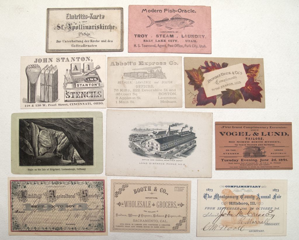 Lot of ten. 1) Abbott's Express, Boston. Vignette of steam train. 2) Dundas Dick & Co., 1875 calendar on back. Tasteless medicine. 3) Dover Machine Works, Dover, Delaware. Iron Founders. Foundry picture on back. 4) Montgomery County Annual Fair, Hillsboro, Illinois, 1873. Sheep vignette. 5) Modern Fish-Oracle, Salt Lake City. Envelope. 6) Einritts-Karte, German card. 70 Jersey Coffee, Dayton, Ohio. Advertising photo-lithographic view cards. 8 John Stanton, Engraver and die sinker. Cincinnati. 9) Kitchfield Agricultural Society. 10) Booth & Co, Sacramento. Wholesale & Grocers.