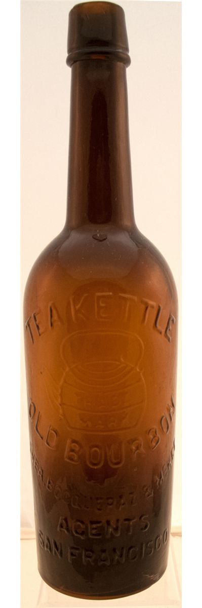This is the most famous of all Western whiskeys. Very popular with Comstock miners and many bottles have been dug in Virginia City. Heavy whittle! Applied top! TEAKETTLE / picture of teakettle with TRADE MARK inside / OLD BOURBON / SHEA, BOCQUERAZ & McKee / AGENTS / SAN FRANCISCO. 12", cylinder fifth, 1873-1885. Barnett #729.