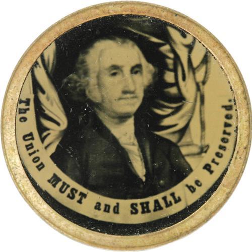<B>Choice Civil War Patriotic Ferrotype.</B></I> Image of George Washington taken from a print, with "The Union Must and Shall Be Preserved" on streamer below. Pristine condition, diameter 25mm. Blank metal back with two small holes, as made. Nice!