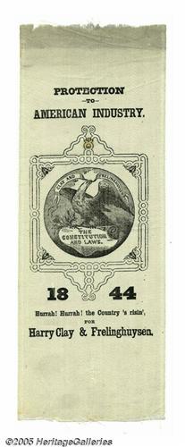 <B>Choice, Distinctive 1844 Henry Clay Silk Campaign Ribbon</B></I> A refreshing change from the familiar Clay portrait designs. The eagle holds a "Clay and Frelinghuysen" banner in his mouth, and at the bottom is the tag line from one of the classic political campaign songs: "Hurrah! Hurrah! The Country's risin', for Harry Clay and Frelinghuysen." Crisp and "minty" but for minor light water stain at very top. Large size, length 8.5". Lot:256