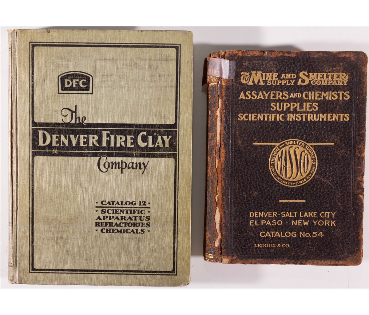 Two Denver scientific catalogs: 1) THE MINE AND SMELTER SUPPLY COMPANY ASSAYERS AND CHEMISTS SUPPLIES AND SCIENTIFIC INSTRUMENTS Catalog 54 from 1920. Black cover, gold embossing. Illustrated catalog of assayers’ and chemists’ supplies. Cover is peeling and chipping away from the book; worn edges and spine. 2) THE DENVER FIRE CLAY COMPANY Catalog 12 from 1934. Hard cover, cloth bound in metallic green. A fully illustrated catalog of assayers’ and chemists’ supplies. Stamped several times on inside of front cover and front pages “Return to/ Design Div.” with some wear on hard board edges and spine. The Denver Fire Clay company is among the most famous and longest lasting companies of this type. - Ken & Rosemary Roberts Collection -59851