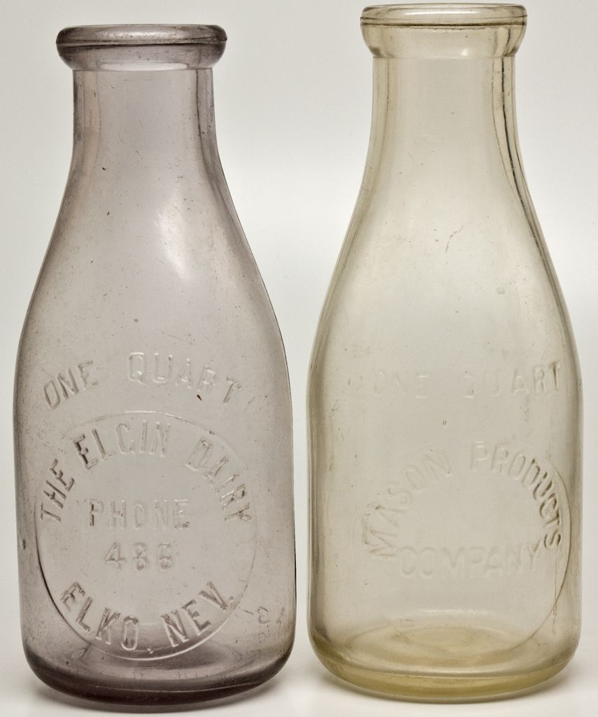 Lot of 2 choice dairy bottles including 1) One quart dairy bottle. “One Quart” embossed over the slug, which is embossed “The Elgin Dairy/ Phone/ 486/ Elko, Nev.” Bottom bears no maker’s mark. Light purple hue to glass indicates presence of manganese during production, dating this bottle to before 1910. Two small bubbles, expected wear along mouth. This bottle is considered rare, with fewer than 5 known specimens. 2) One quart dairy bottle. “One Quart” embossed over the slug, which is also embossed “Mason Dairy Products/ Company.” Clear glass with a yellow cast, small chips in foot and mouth, two small blisters throughout body. This bottle is dated c. 1914 and is considered scare, with perhaps 5-10 other specimens known [Ref: Nevada History Through Glass, Vol 1, Fred Holabird, 2012, p. 266-7]. - Jacobitz Collection -59513