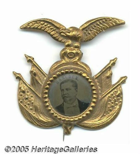 <B>Choice, Fancy 1880 Winfield Scott Hancock Ferrotype Pin</B></I> A near-mint beauty with full luster on the brass shell frame. For strictest accuracy we note a trivial surface emulsion imperfection where Hancock's left shoulder joins the rim, but it is of no consequence. A gorgeous example for a very tough candidate. Lot:259