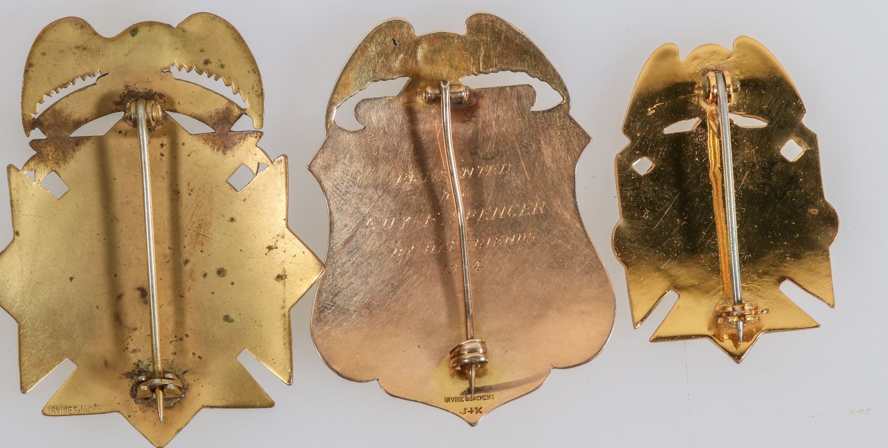 Absolutely choice trio of gold Walnut Creek, California Fireman's badges. The oldest is 14kt, engraved to Guy Spencer on the back, 1924.