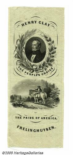 <B>Choice Henry Clay Ribbon</B></I> 3" x 7 1/4" silk ribbon with portrait of Clay within a wreath, a vignette of the Mill Boy of the Slashes, inscribed "Henry Clay. Frelinghuysen. The People's Choice The Pride of America." Great graphics, mint condition - looks like the day it was made! Lot:256
