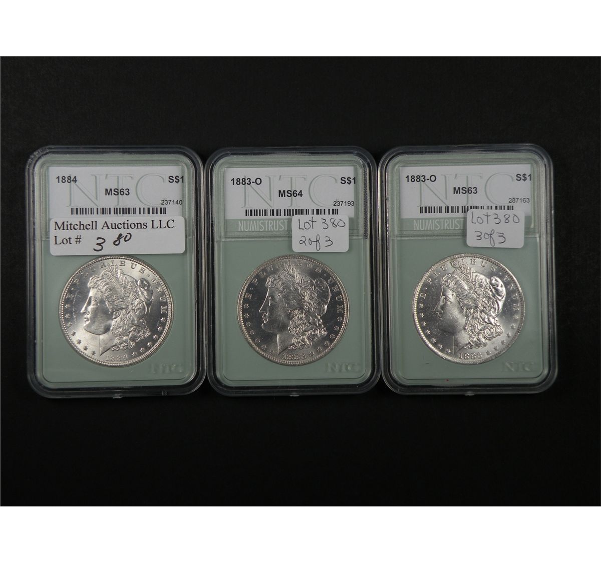 Choice Morgan Dollar threesome: 1883-O (2), 1884. All are NTC MS63 and are very solid for the grade. A total of 3 coins. Est.$160
