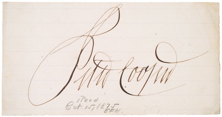 Autograph Signature, “Peter Cooper,” on pale pink paper with blue lines, undated, 2.5” x 4.5,” mounted on a slightly larger card, Choice Extremely Fine. This huge vanity signature measures 3.75” in length and 2” in height. Also included, another card on which a previous collector has written: “Peter Cooper - Philadelphia inventor & industrialist. Built 1st locomotive engine constructed on this continent in 1830 -- saving the B & O RR [Baltimore & Ohio Railroad] from bankruptcy.” Some light pencil notations at the bottom indicating where and when this piece was obtained.