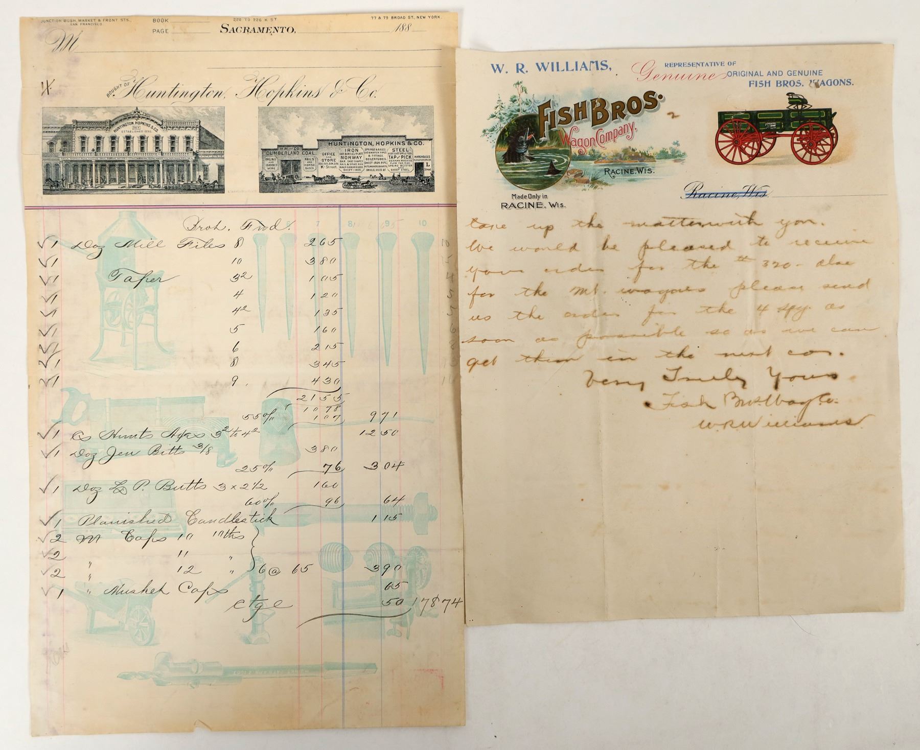Lot of 2 different. 1) Huntington, Hopkins & Co. Sacramento 1880s billhead. Two vignettes of the store and underprint hardware vignettes. Huntington and Hopkins were two of the "Big Four" Central Pacific Railroad founders. 2) Color billhead, not dated, for WR Williams, representative for Fish Bros. Wagons, Racine, Wisconsin. Color vignettes of wagon and fish.