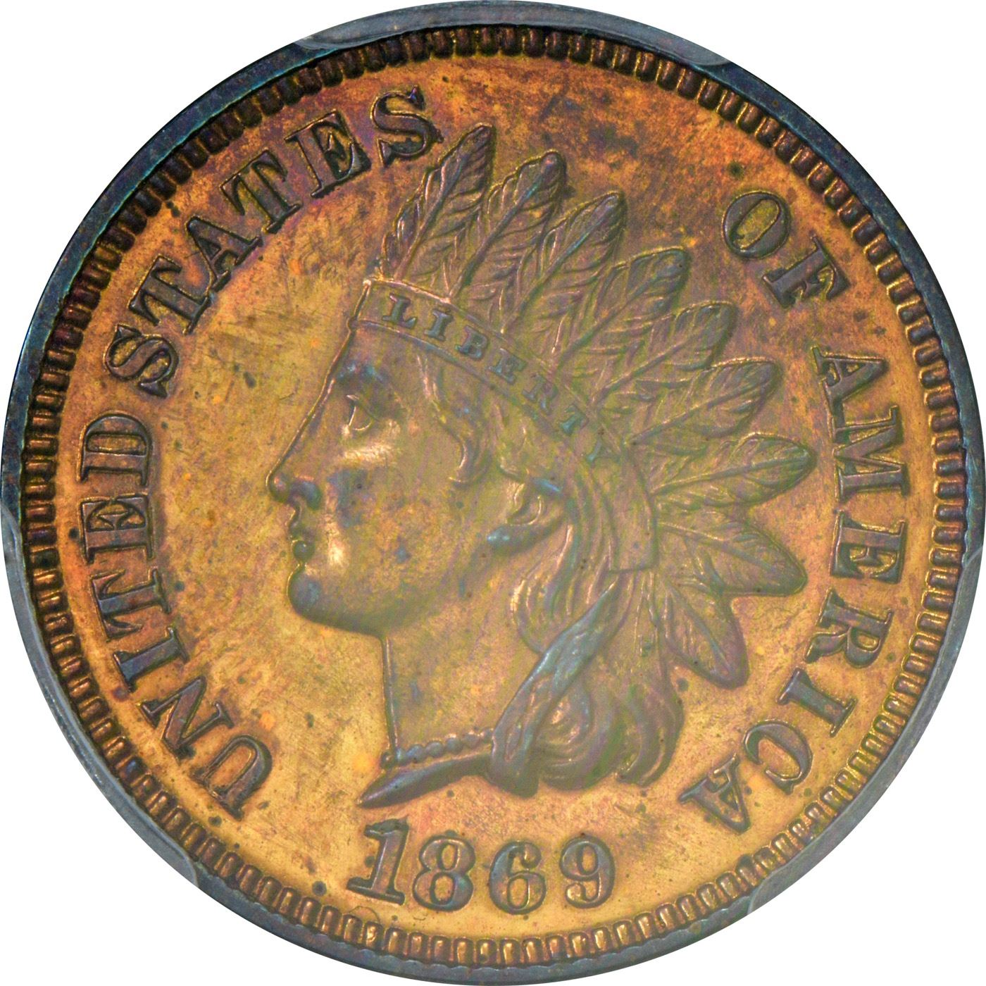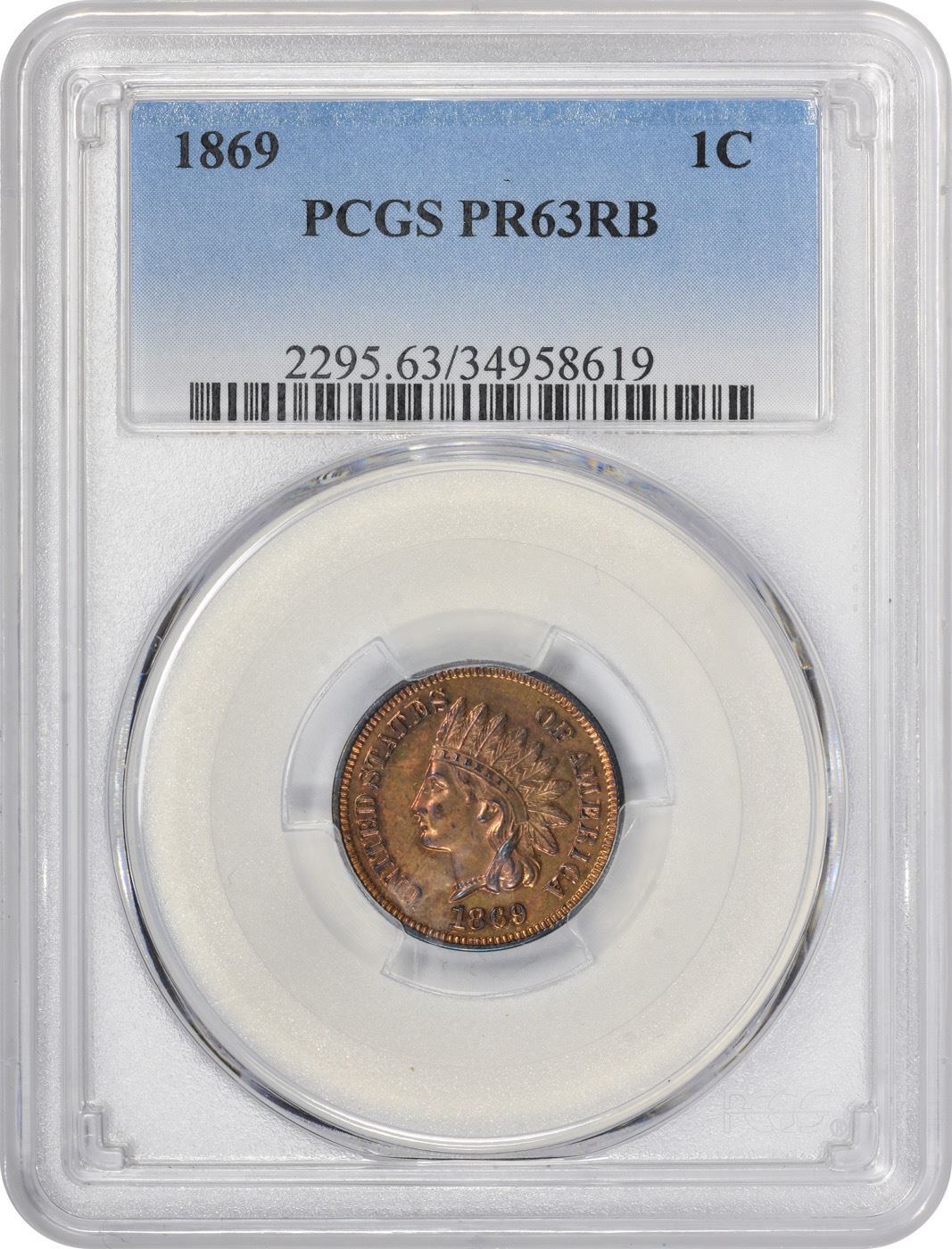 Choice RB Proof 1869 Cent 1869 Cent Proof-63 RB PCGS. Sparkling mint orange with rose and blue highlights. We note some obverse toning flecks under low magnification.
