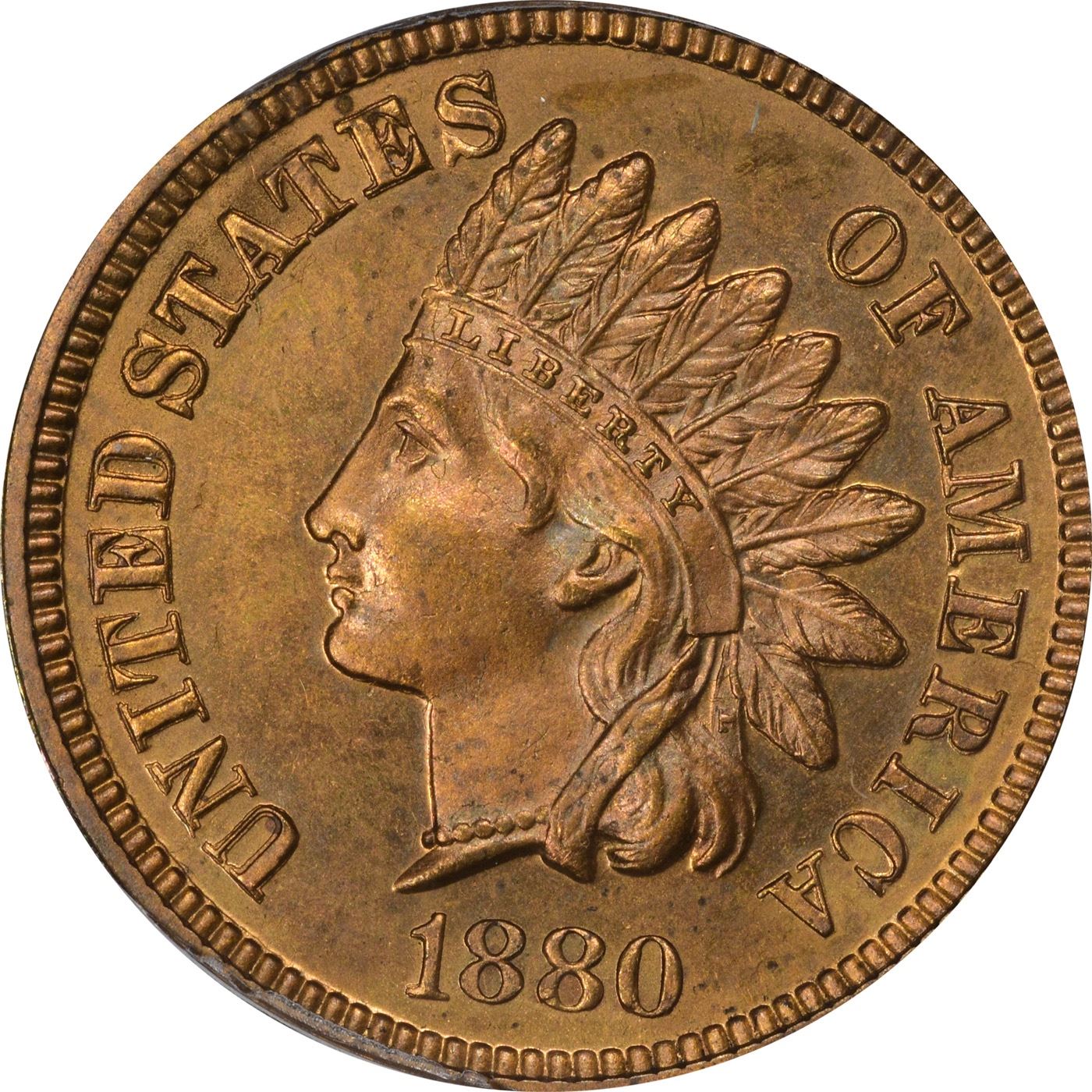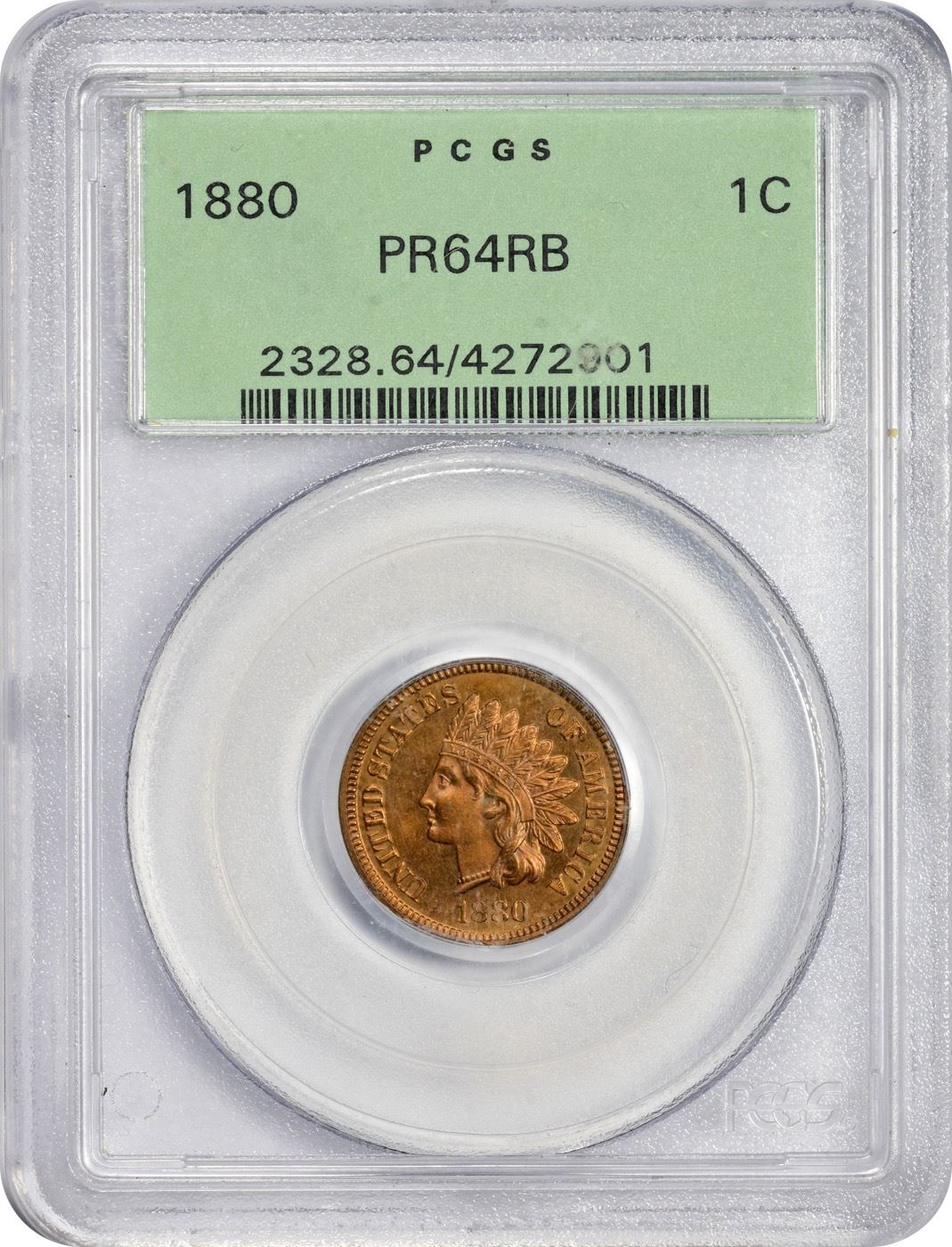 Choice RB Proof 1880 Cent 1880 Cent Proof-64 RB PCGS. OGH. A satiny near-Gem with fiery deep mint orange surfaces and plenty of all-around eye appeal. A bold light source reveals lively sunset orange highlights in the fields, especially on the reverse. Housed in a second-generation PCGS OGH with outer frame.