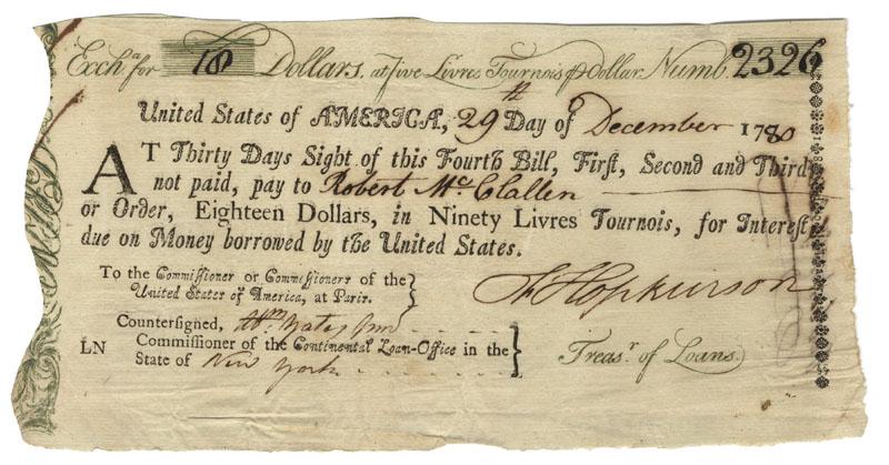 1780, New York. Anderson US 94, 8B. DS. 1 page. 8 ¼” x 4 ¼”. New York. United States signed draft signed as Treasurer of Loans by FRANCIS HOPKINSON (1737 - 1791). Hopkinson represented New Jersy in the Continental Congress and signed the Declaration of Independence. He served in his capacity as treasurer of loans from July 1778 to July 1781, a particularly difficult period of financing for the newly formed nation. "These bills of exchange were issued in uncut sheets of four and were redeemable in Paris. They were watermared United States l, 2, 3 or 4 corresponding to the number on the bill. If the first bill was lost or captured at sea (ship captains had standing orders to weight bills of exchanged and throw them overboard if stopped by a British ship of war), the holder would then send the second bill, and so on." (Anderson). Excellent condition.