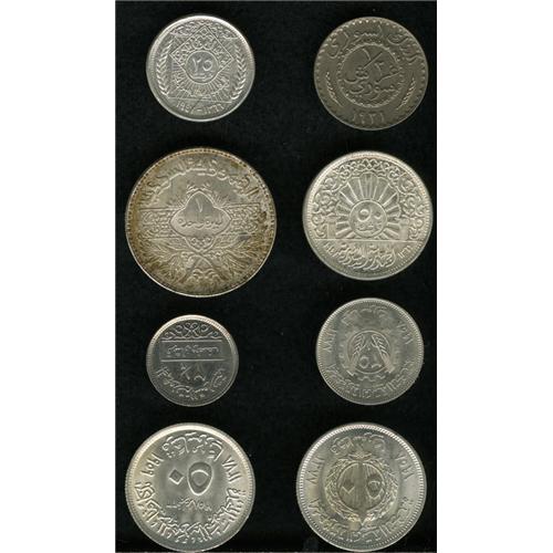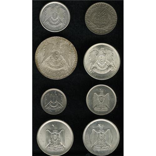 <B>Choice Syrian Minors Collection, </B></I>eight pieces including: KM68 1/2 Piastre 1921, lightly toned UNC, KM79 25 Piastres 1947 UNC, KM80 50 Piastres 1947, choice frosty UNC, KM81 2 1/2 Piastres 1948 UNC, KM85 Lira 1950, superb toned UNC, very scarce this nice, KM87 25 Piastres 1958 UNC, KM88 50 Piastres 1958 UNC and KM89 50 Piastres 1959. An unusually nice grouping with several surprisingly scarce types included. <B>Sold as is, no return lot.</B></I>