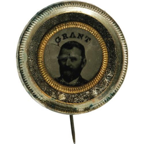 <B>Choice Ulysses S. Grant Ferrotype Campaign Pin.</B></I> Two very trivial tiny marks, almost invisible without magnification, detract little from this beauty. Original pin on reverse. Diameter 23mm.