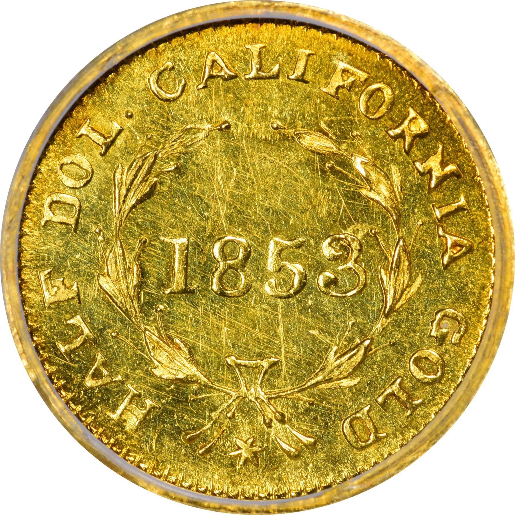 Description: 1853 round Half Dol., BG-428, Die State I (perfect dies). PCGS MS63. Similar small Liberty head, 14 pearls on coronet, bust point close to 1st star, sharp-pointed dentils; similar reverse, but date changed to 1853 (round-top 3), star below wreath, 3 pairs of berries on each branch, another at top, an extra outer berry between left stem and lowest leaf. Style of Nouizillet, though unsigned. Choice Brilliant Uncirculated! PCGS MS63 William C. O’Connor (PCGS# 10464).