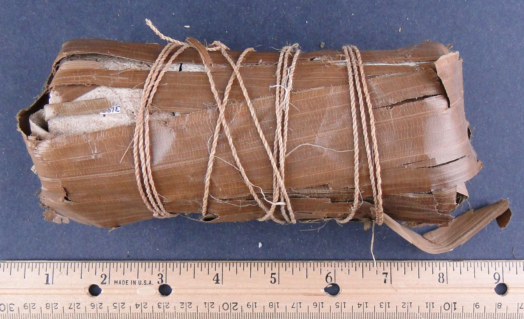 Description: Kesa consists of sets of thin-walled cylinders now thought to be carved from the shell of a sea worm (or possibly the giant clam, tridacna), used as money on Choiseul Island, Solomon Islands. The natives believe them to be supernatural. This lot contains a single perfect cylinder, or mata, 3 inches in diameter, and three mata bound together in ivory-nut palm leaves, called a salaka. (Three salaka, bound with a cord, made a full kesa.) All surviving elements of the kesa system are very old. Both pieces in this lot illustrated in Opitz, p. 175, upper left.