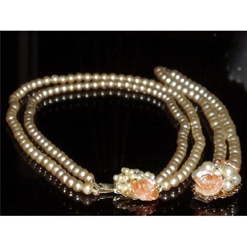A Beautiful Vintage Necklace and Bracelet with pearl colored beads and rhinestones. The choker consists of two strands of pearl colored beads of identical size. The box clasp has tiny beads and rhinestones and a pink rose fashioned out of ? with a pearl color finish. The necklace measures 13 inches. The 7" bracelet has two strands of larger identical beads. The box clasp is the same style as the necklace but the beads, rhinestones, & roses are larger and there are two roses. My description doesn't do this set justice so please take some time to view the pictures. I recently had this set restrung, the clasps reinforced and the pieces cleaned, so they are ready to complete your special outfit..or to give to that special someone.