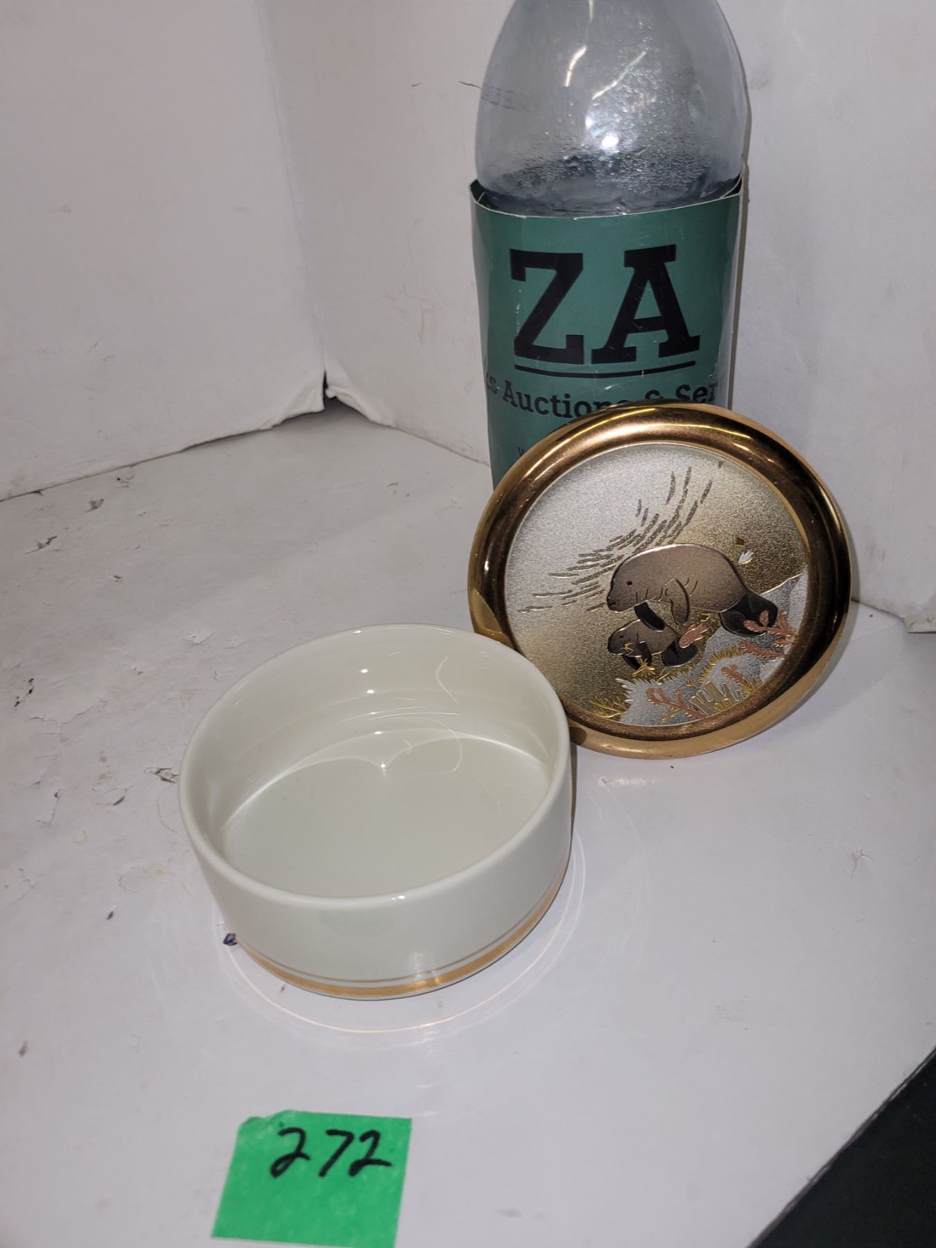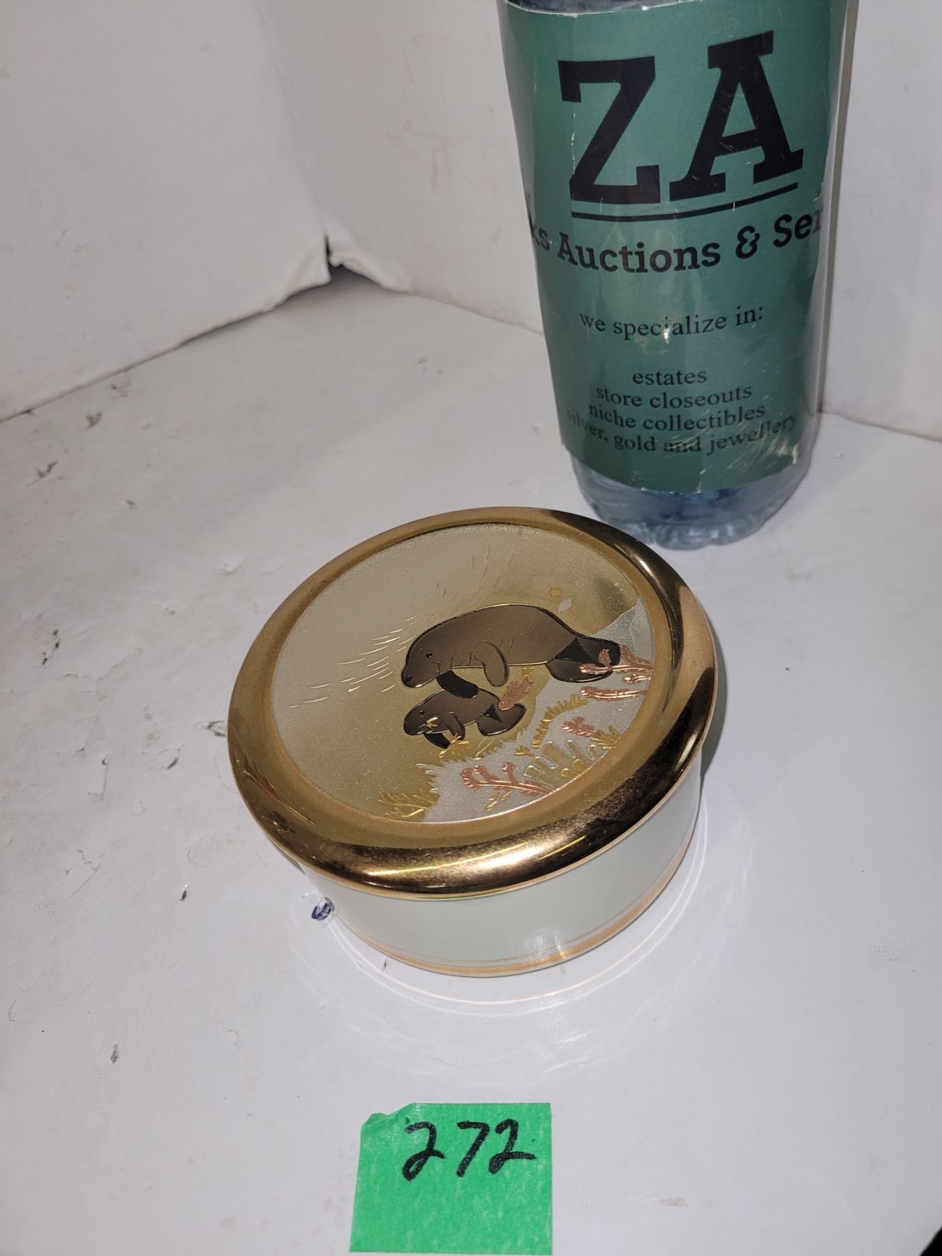 Chokin dish with gold lid with manatees on lid
