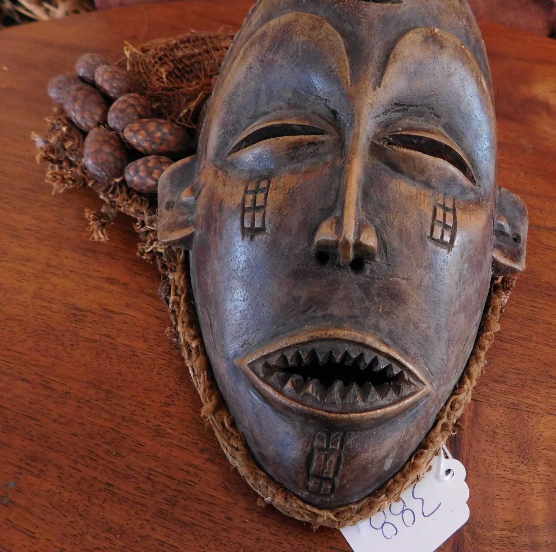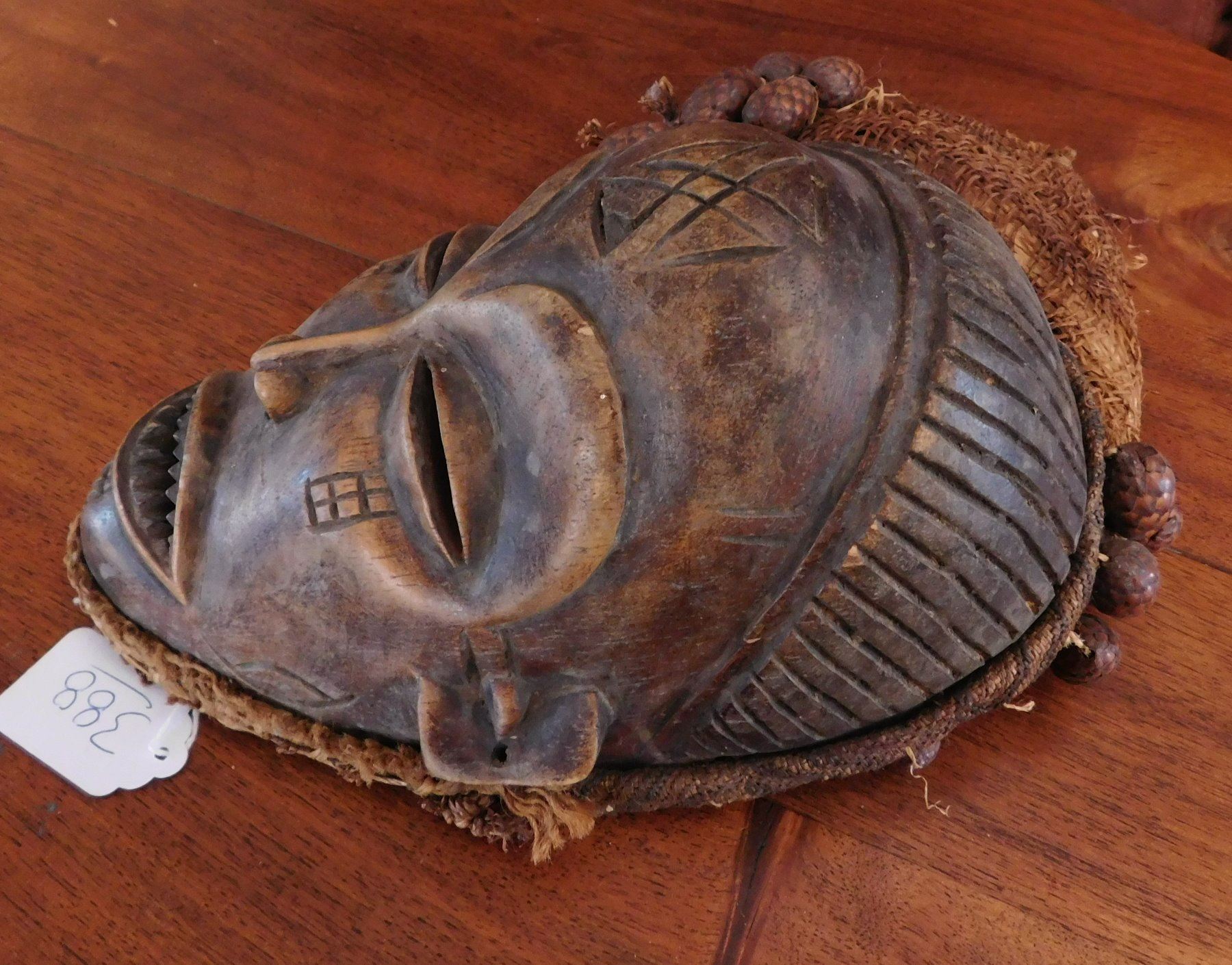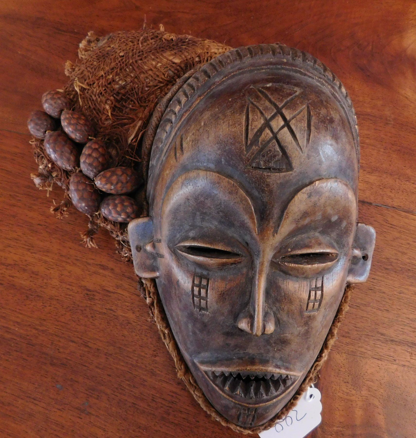 Chokwe Mask, early 20th century item. Made of hardwood and raffia, seed pods, the item measures 11". Congo. Scarification on face. Condition: Good, see images. Shipping: $24.50 w/insurance and signature.