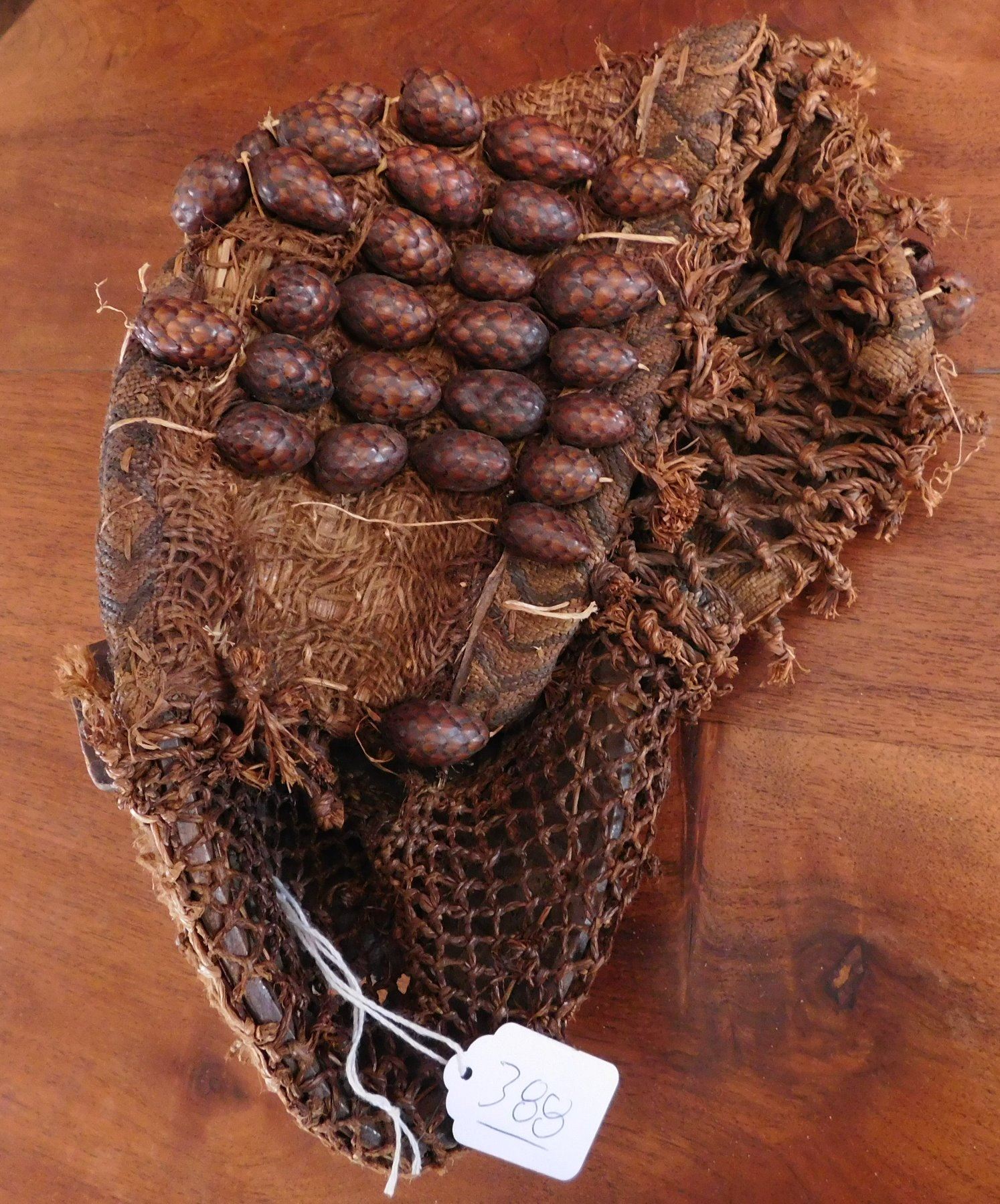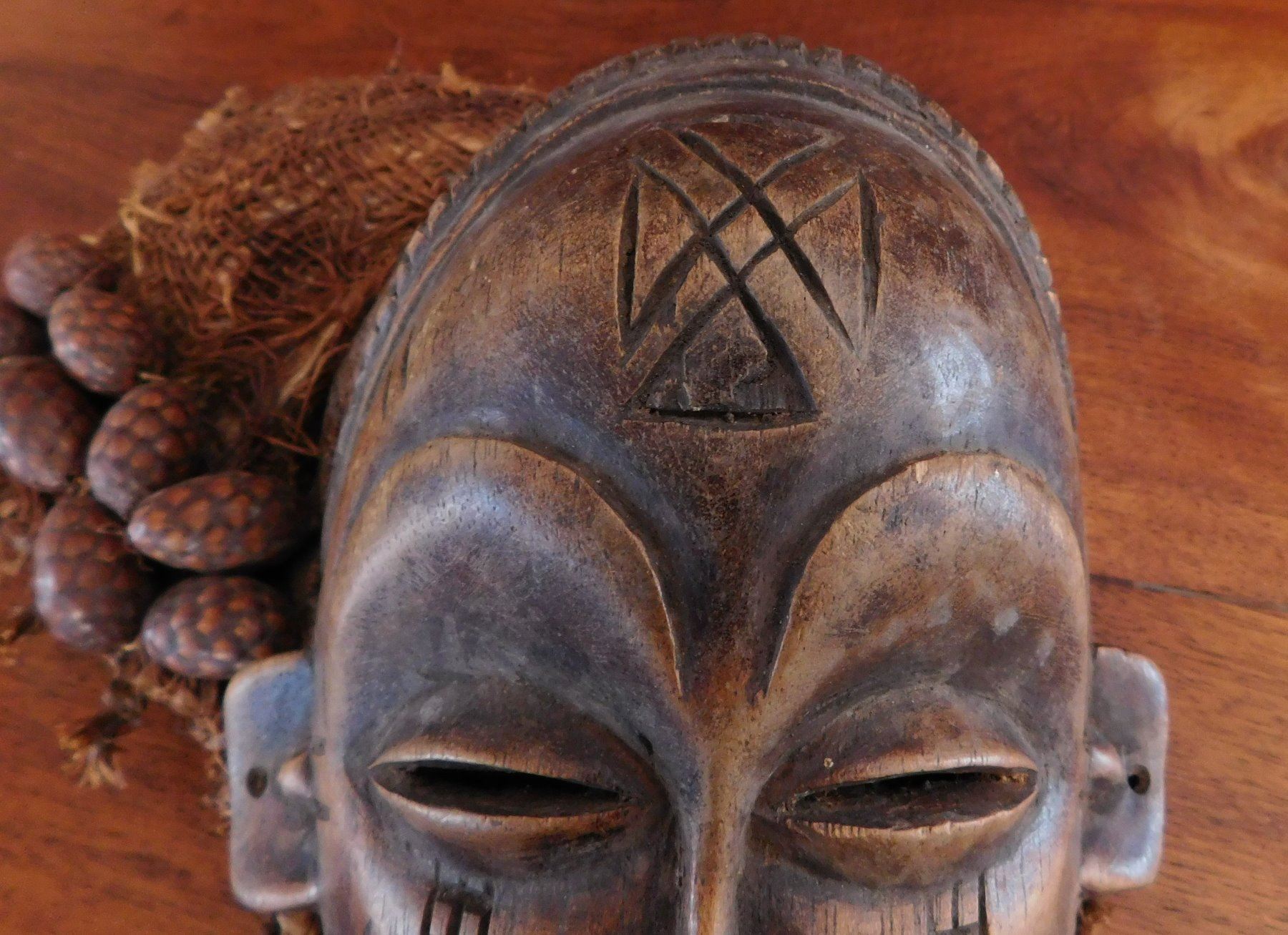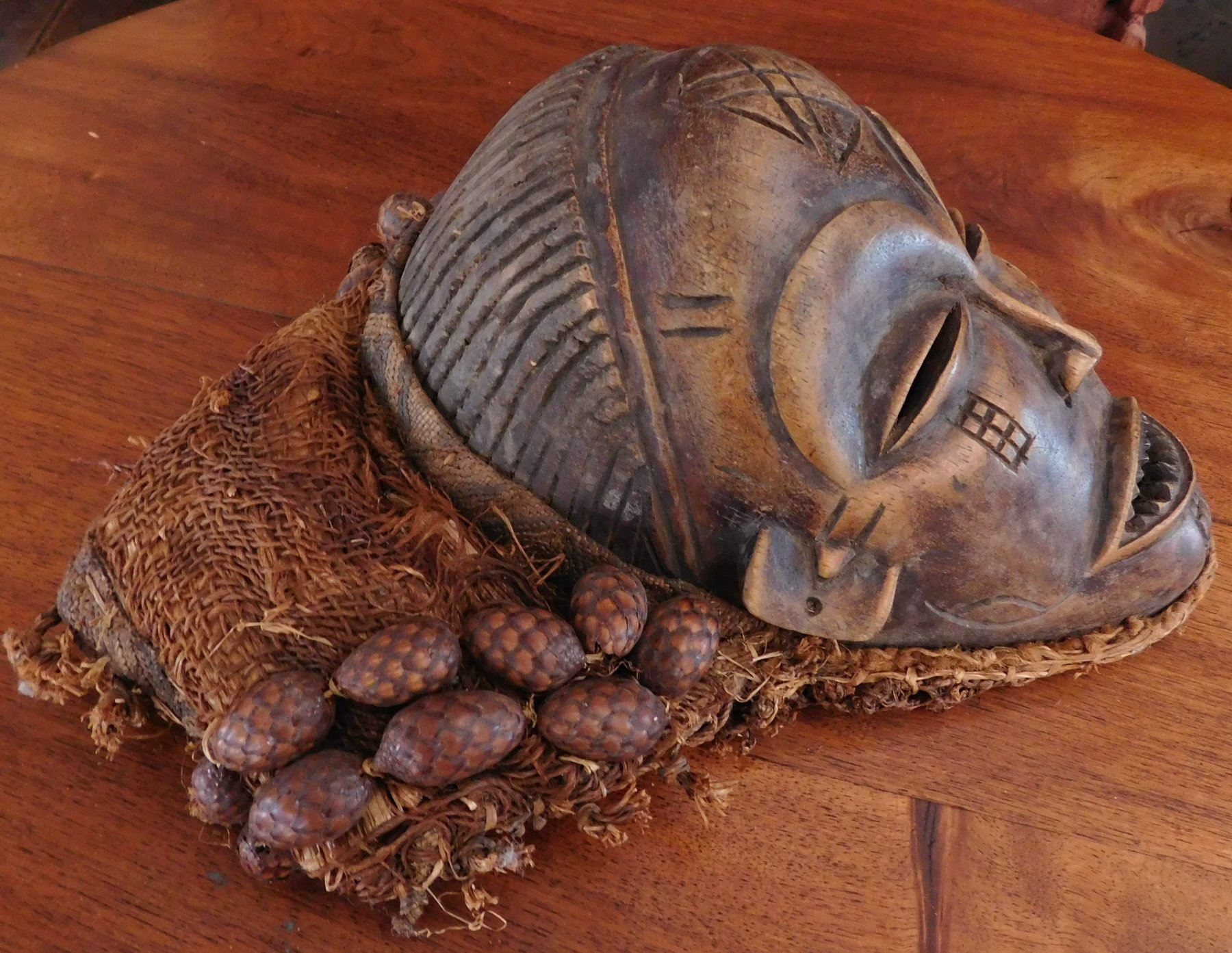Chokwe Mask, early 20th century item. Made of hardwood and raffia, seed pods, the item measures 11". Congo. Scarification on face. Condition: Good, see images. Shipping: $24.50 w/insurance and signature.