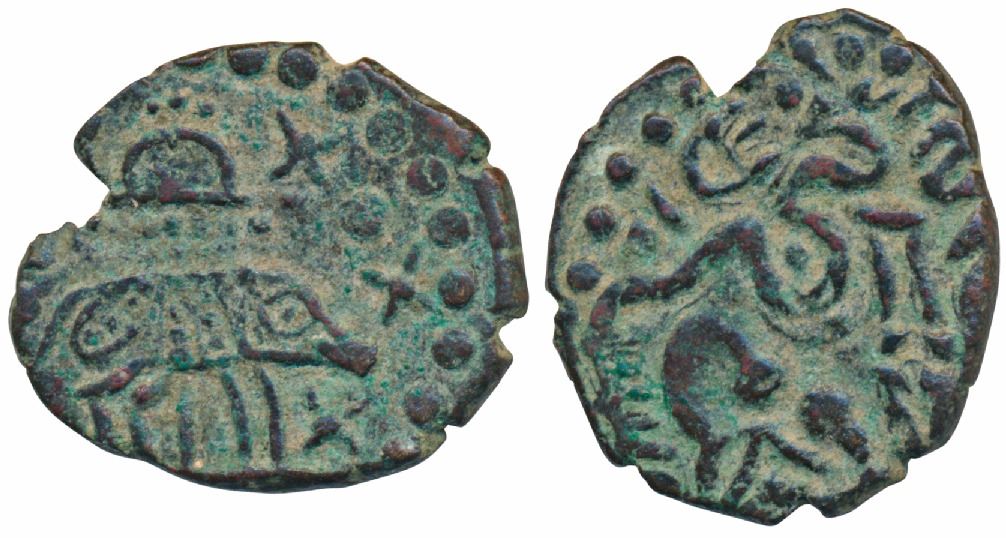 Cholas, Kulottunga Chola (1070-1120 AD), Copper Kasu, 2.7g, obv. king reclining on a mat, rev. a boar standing right with an umbrella above, with sun and star symbols. Very Fine+, Very Rare.