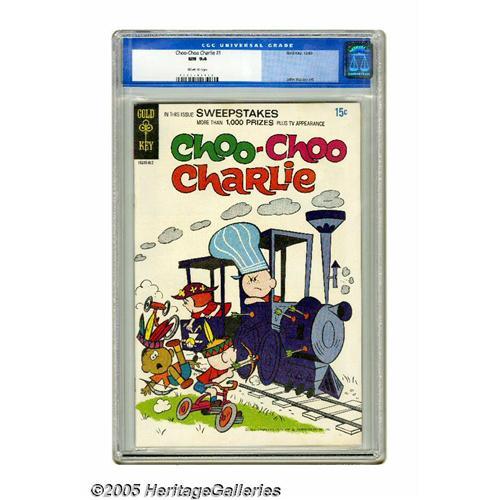 <B>Choo-Choo Charlie #1 (Gold Key, 1969) CGC NM 9.4 Off-white pages.</B></I> The only issue of the title. John Stanley art. Overstreet 2005 NM- 9.2 value = $140. CGC census 8/05: 4 in 9.4, none higher. <BR><BR><B>Important notice:</B> Heritage usually auctions material at the rate of 200-250 lots per hour. On some occasions eBay Live bid software or the Internet may not be able to keep up with the pace of the auction. We recommend placing a realistic absentee bid now as insurance to avoid disappointment. Occasionally the auctioneer may eliminate or reject an eBay Live bid, and the auctioneer may also reopen a lot after the close of the eBay live bidding (usually because we missed an audience bid), and may reject your bid even if it shows you as the winning bidder. By bidding via eBay Live, you agree that Heritage may award the lot to another bidder at its sole discretion under the circumstances described above or any other reasonable circumstances. Since eBay bids are not shown to us until we open the lot on the floor, we treat those bids just like floor bids. In most cases the floor responds before the eBay bid is presented to us, due to Internet lag time, so for consistency we have made it a policy that floor bids are always considered first over tie eBay live bids. Also please note that all Heritage lots purchased through eBay Live carry a 20% Buyer's Premium. Please make sure you read the Terms and Conditions before you bid. This lot is being auctioned in conjunction with a live floor auction by Heritage Galleries & Auctioneers. All final auction and invoice information will be supplied by Heritage Galleries & Auctioneers, and all other information should be considered preliminary. Lot:1401 <BR><BR><B>Winning Notification and Billing:</B> After the FINAL session in this auction is complete, Heritage will send e-mail and snail mail invoices. This process normally takes several days. All final auction and invoice information will be supplied by Heritage Galleries