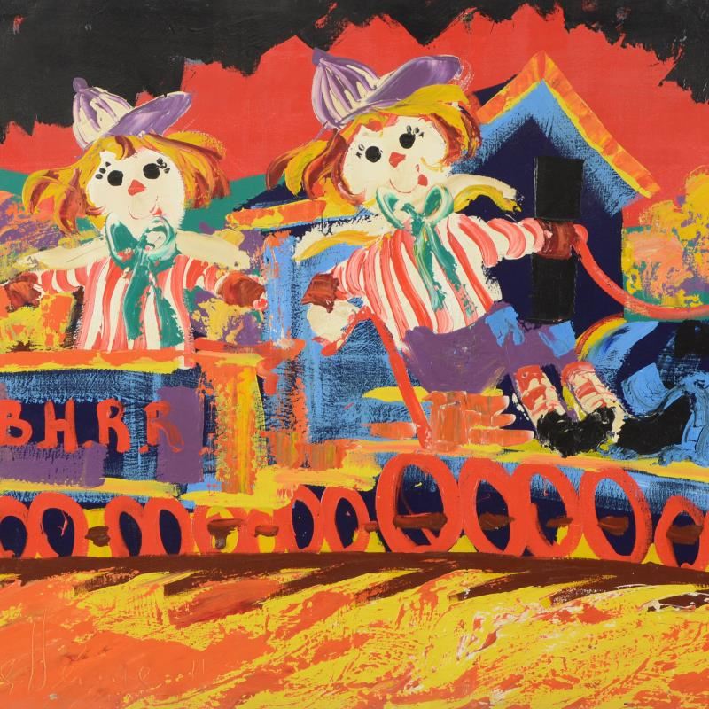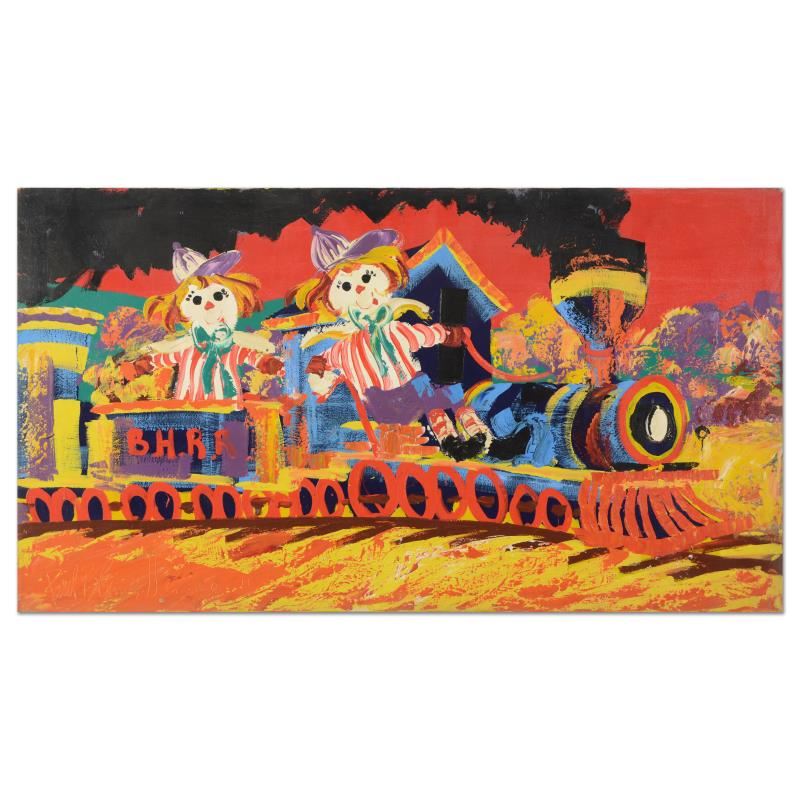 "Choo Choo Children" is an original oil painting on stretched canvas by Paul Blaine Henrie (1932-1999), hand signed by the artist. Includes Letter of Authenticity. Measures approx. 72" x 40" (image). Due to the age of this piece and the way it was stored, there are minor sings of wear, particularly on the corners and edges.