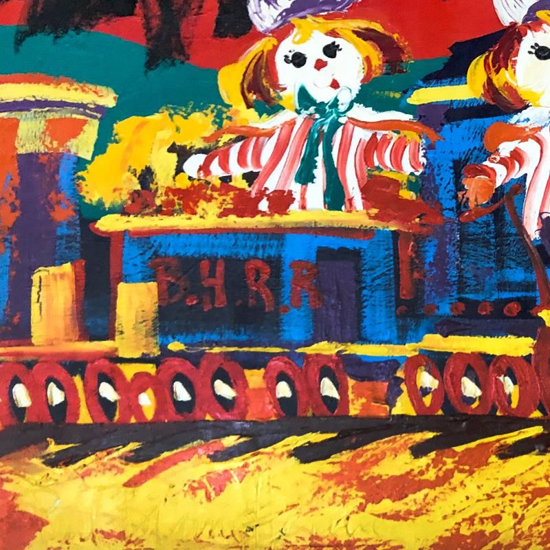 "Choo-Choo Children" is an original oil painting on stretched canvas by Paul Blaine Henrie (1932-1999). The piece is hand signed by the artist and comes with a letter of authenticity. Please note that due to the age of this piece and the way it was stored, there are minor sings of wear, particularly on the corners and edges. Measures approximately. 40" x 72" (image).